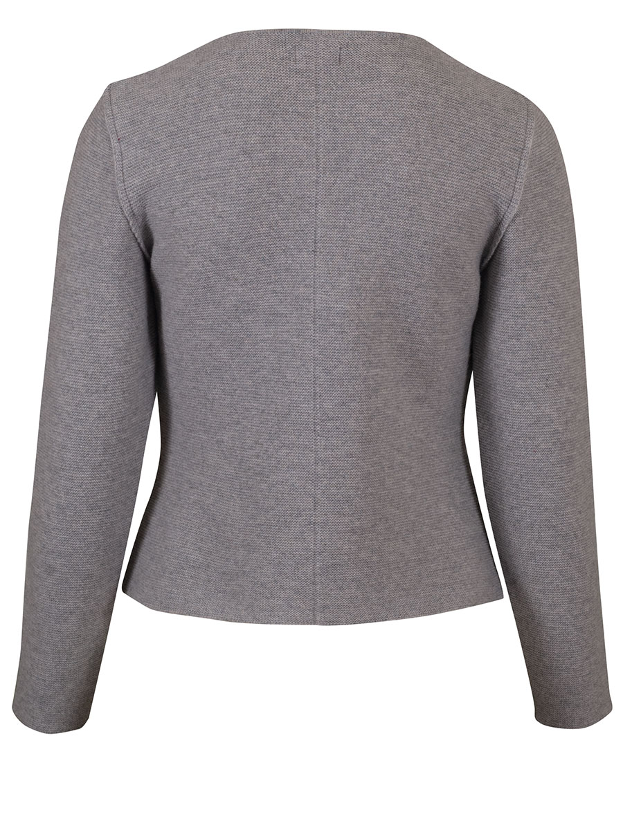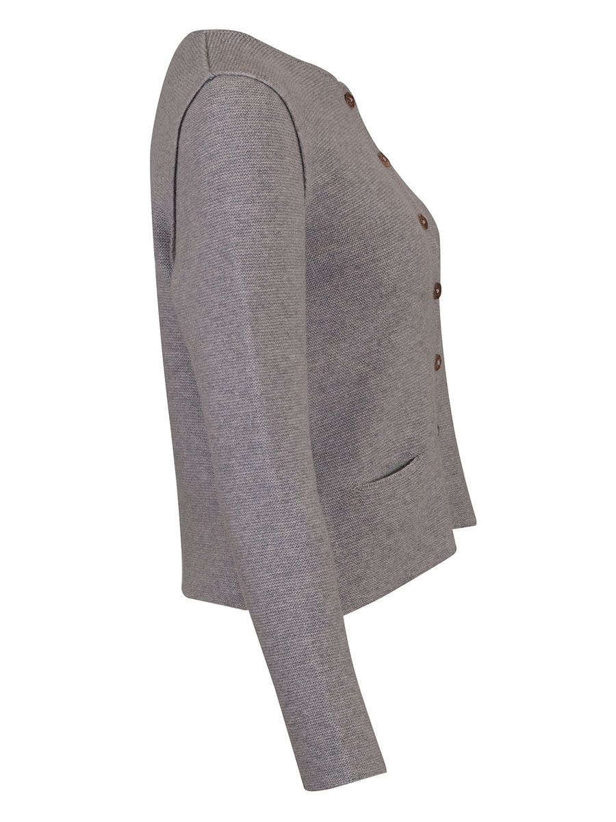 Die sanftgraue Damenjacke wird mit schimmernde Perlmuttknöpfe in Holzoptik geschlossen. Rechts und links gibt es je eine kleine dezente Tasche.