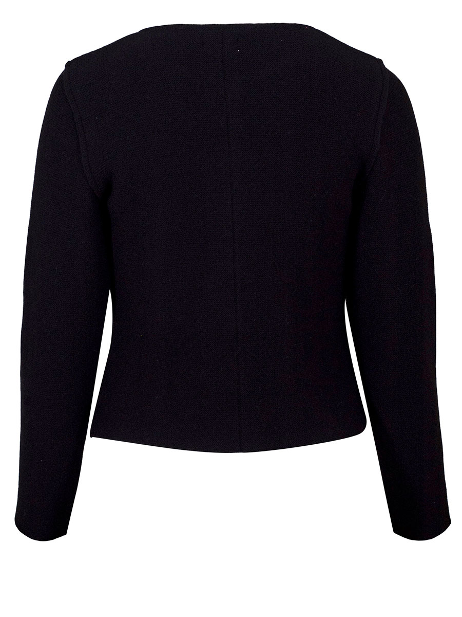 Die schwarze Damenjacke wird mit schimmernde Perlmuttknöpfe in Holzoptik geschlossen. Rechts und links gibt es je eine kleine dezente Tasche.