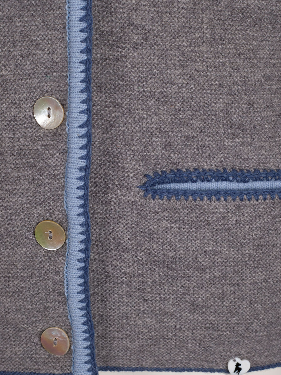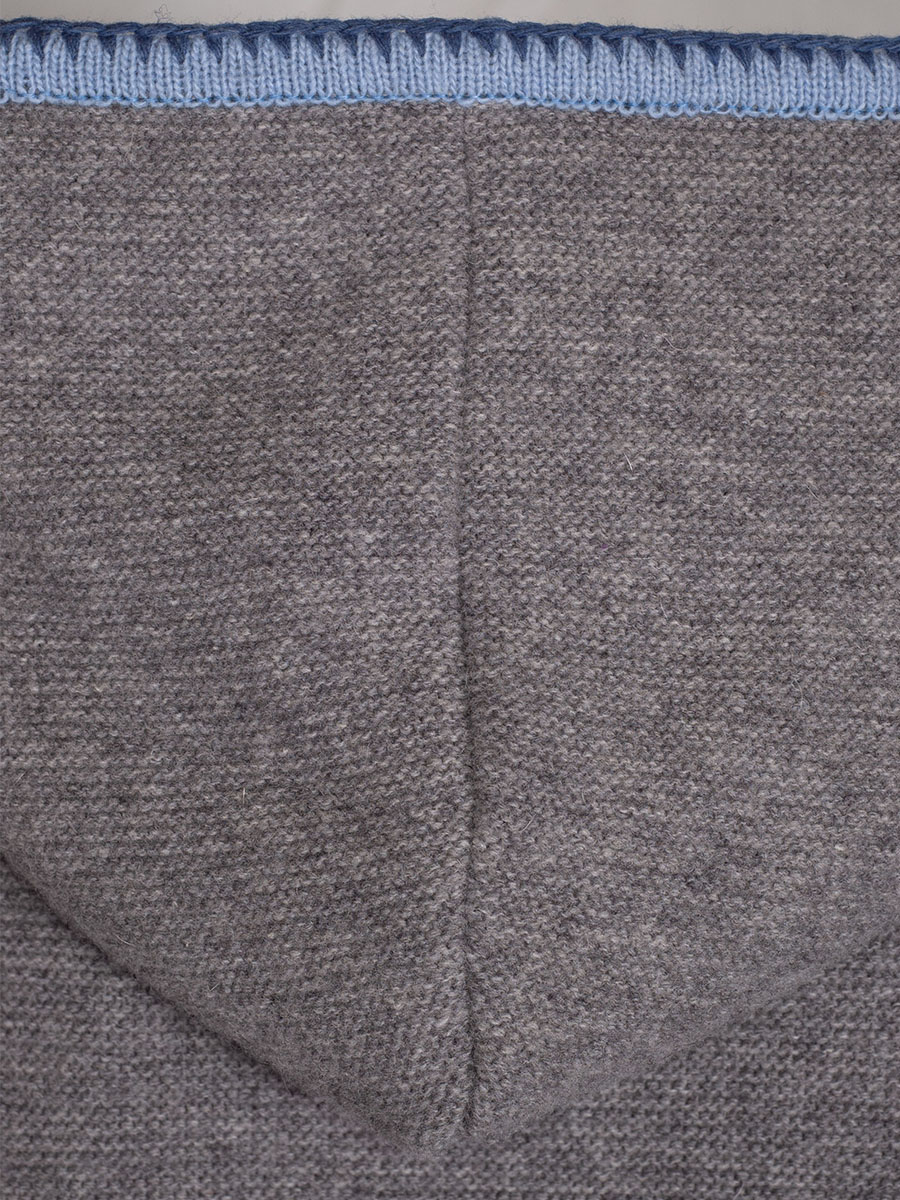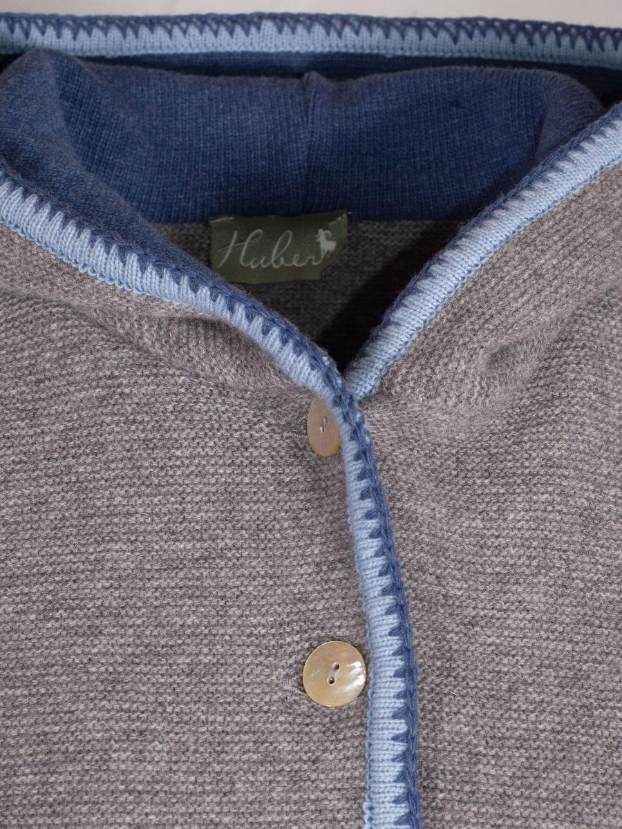 Sportliche Kapuzen-Strickjacke aus grauer Wolle gefertigt mit einer hellblauen und blauen Einfassung. Die Kapuze ist innen flauschig und ein einem blauen Farbton gefüttert. Neben der Kapuze hat die Strickjacke noch zwei seitliche Taschen und sie wird mit Perlmuttknöpfen geschlossen. Etwas länger geschnitten ist sie ein wunderbarer Begleiter durch den Herbst und Frühling.