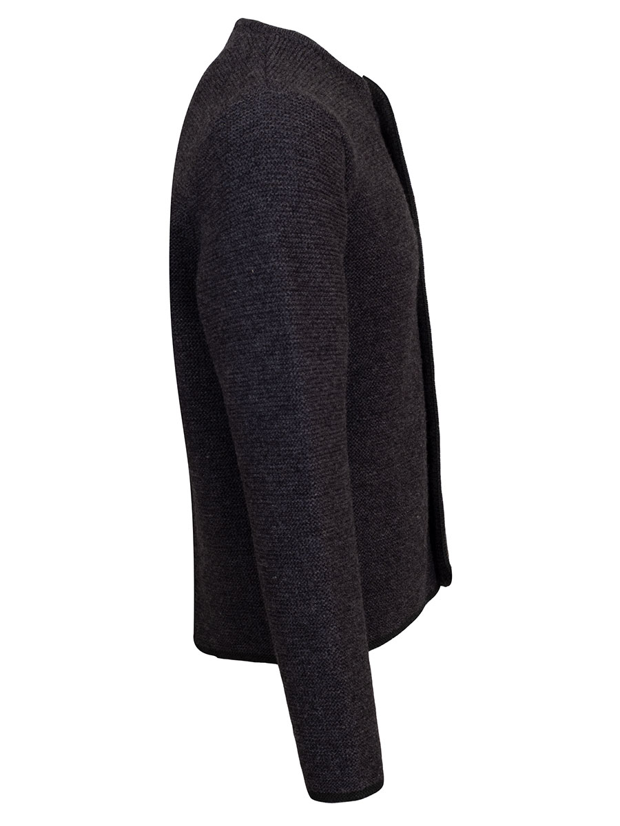 Klassische Trachtenstrickjacke in der Farbe anthrazit. Die Herrenjacke aus reiner Wolle wird mit Hirschhornknöpfen geschlossen und ist an allen Abschlüssen tannengrün eingefasst. Durch ihre Schlichtheit lässt sich die Strickjacke zu vielen Kleidungsstücken kombinieren.