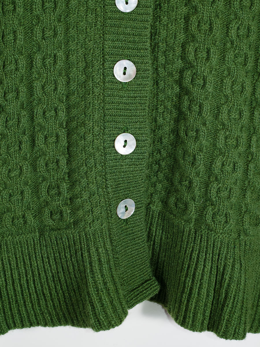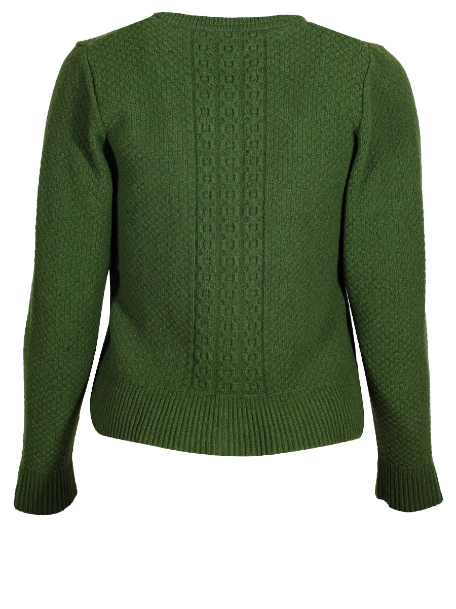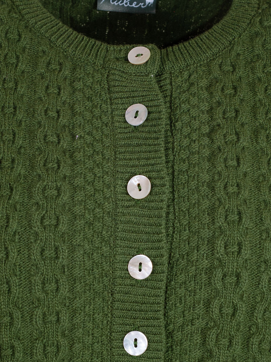 Zeitlos schön. Süße, grüne Strickjacke der Qualitätsfirma Huber. Ins Auge fällt das abwechslungsreiche Strickmuster. Die Armabschlüsse und der Körperabschluss sind im Volantstil gestrickt. Geschlossen wird die Damenstrickjacke mit hellen Perlmuttknöpfen.