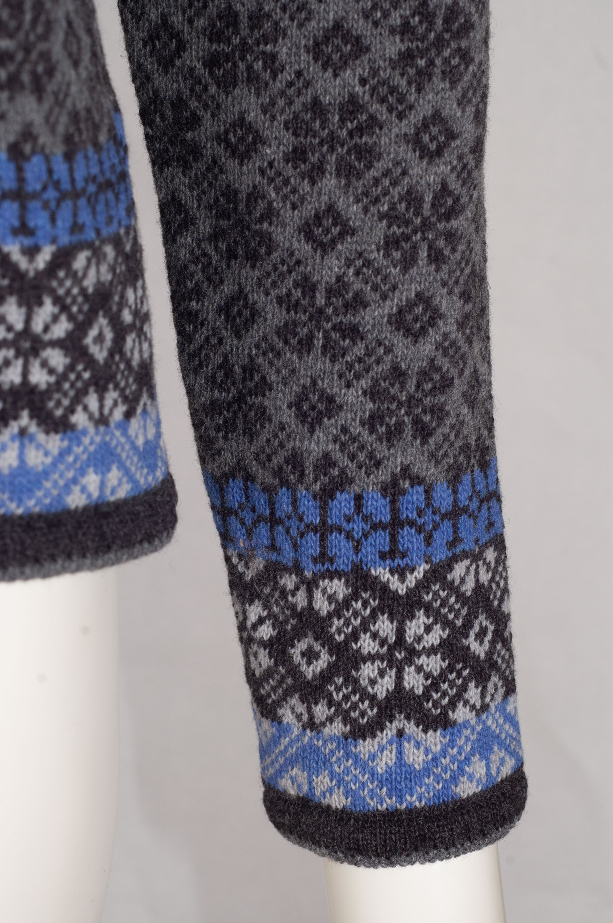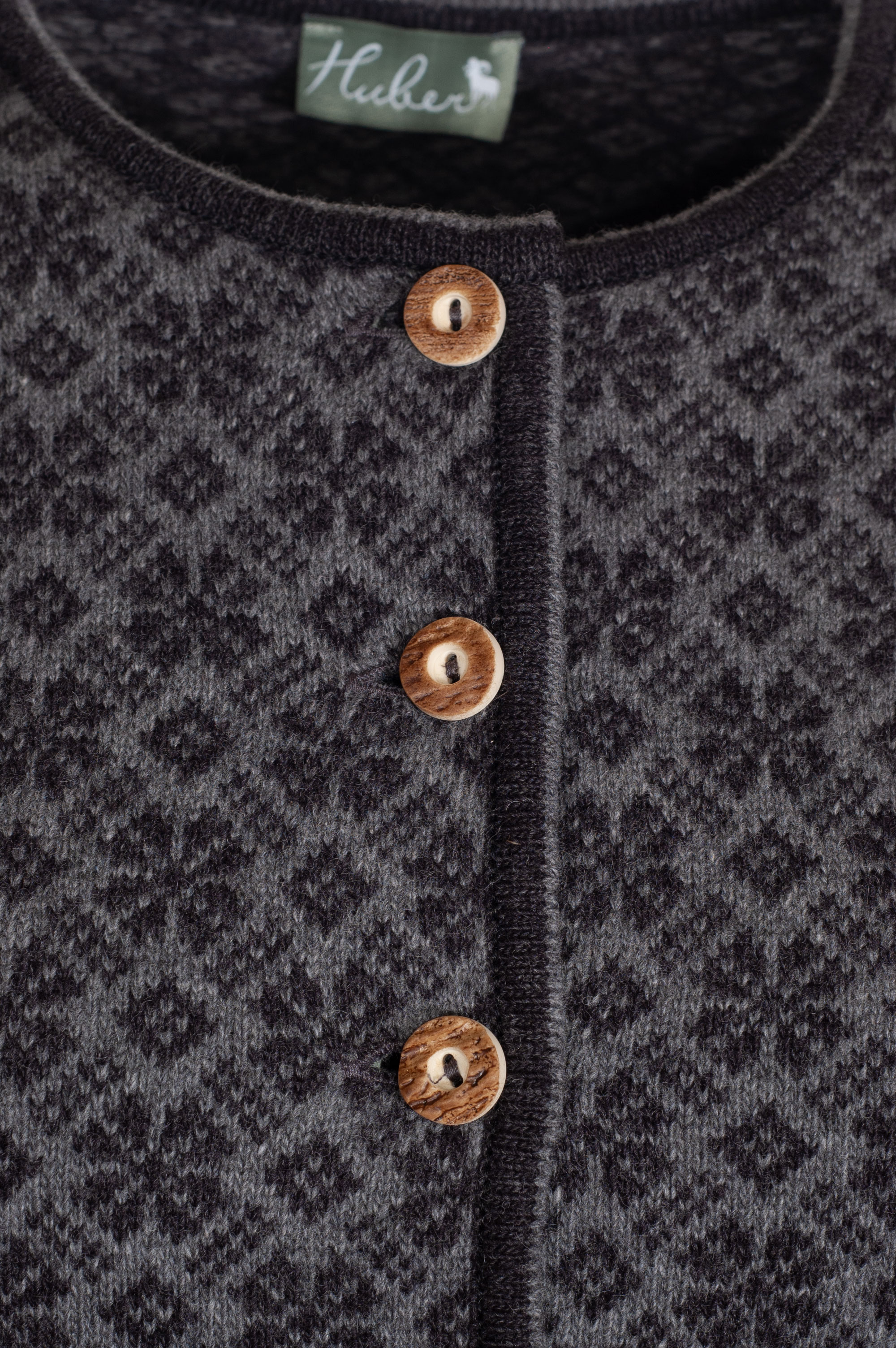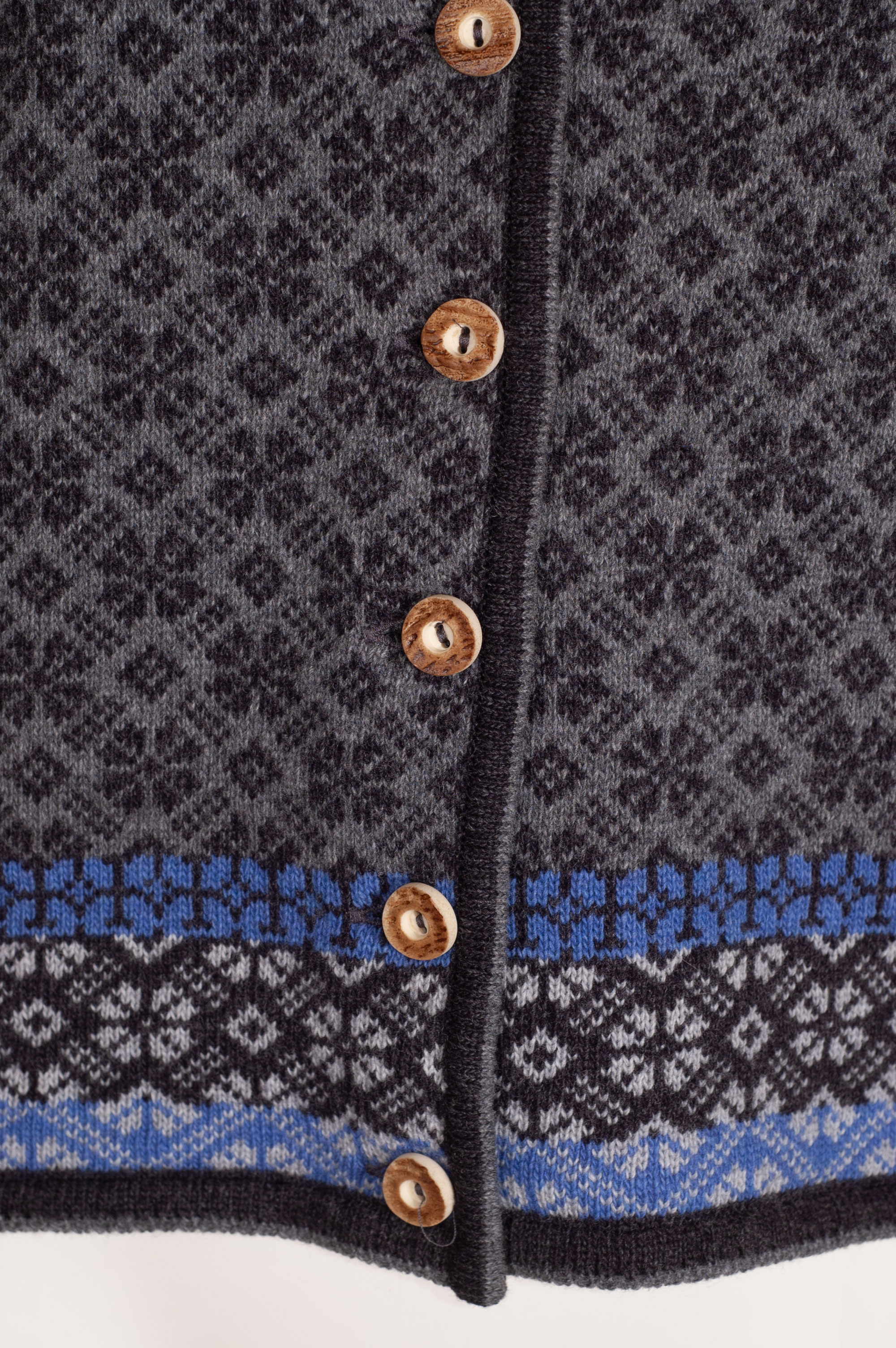 Wunderschöne gemusterte Strickjacke Jutta der Firma Huber. Vorder- und Rückseite der Damenjacke sind in einem grau-hellgrauen Muster gestrickt. Die Knopfleiste sowie alle Abschlüsse sind dunkelgrau eingefasst. Auffällig ist das breite Norwegermuster in Grau und Blau an den Abschlüssen der Damenjacke. Geschlossen wird die trachtige Strickjacke mit Hirschhornknöpfen.
