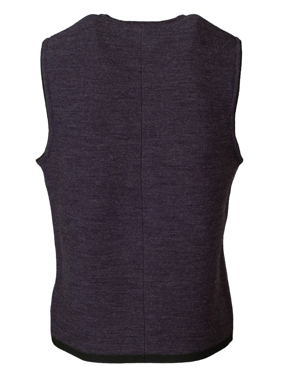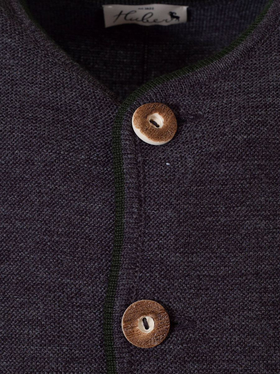 Etwas leichtere und feine Strickweste der Firma Huber in anthrazit. Die Herrenweste hat eine dunkelgrüne Einfassung an Kragen, Arm- und Körperabschluss und wird mit Knöpfen in Hirschhornoptik geschlossen.