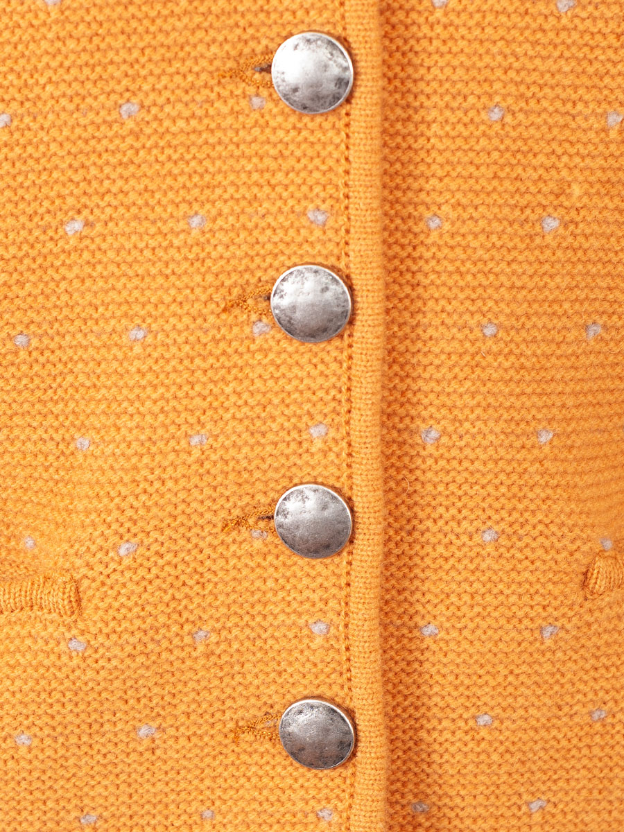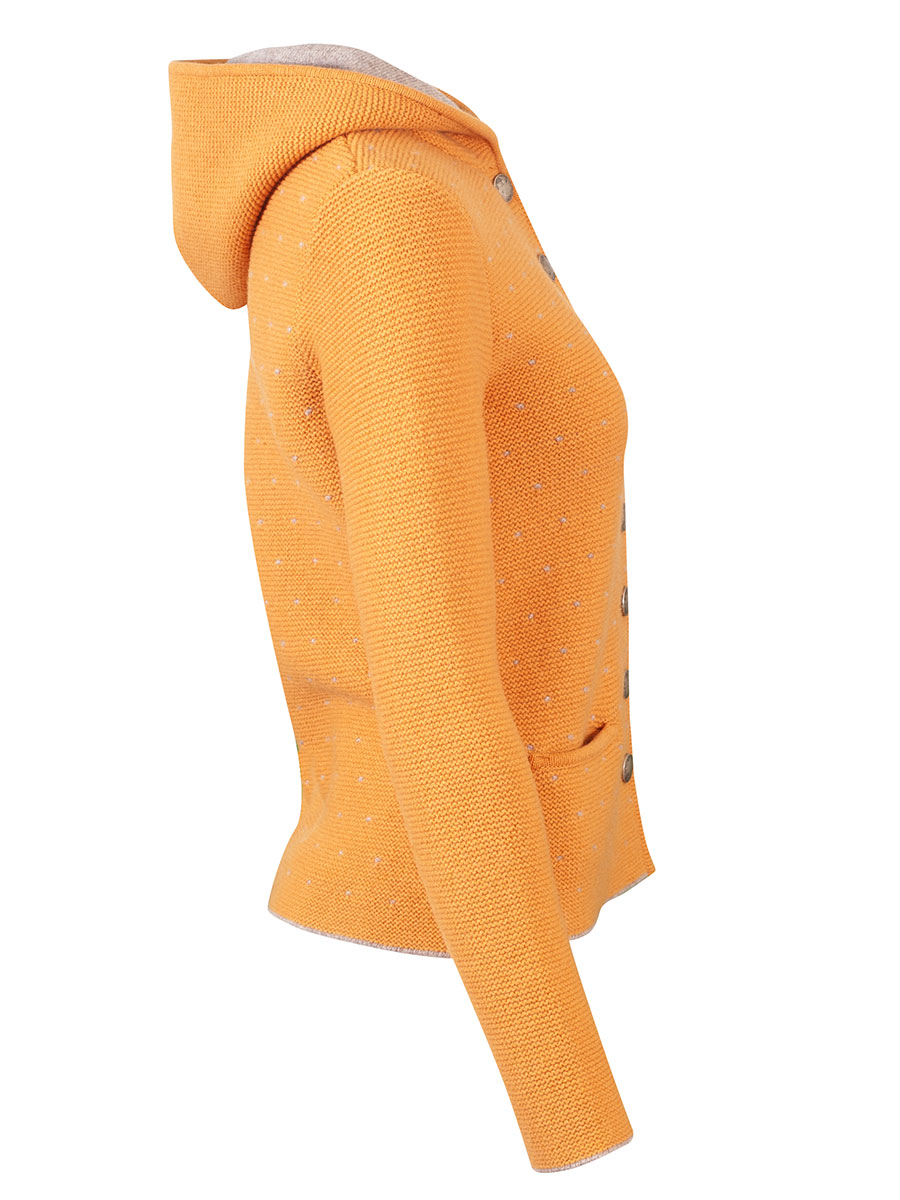 Länger gestrickter Kapuzenjanker -warm und kuschlig- in goldgelb mit silbernen Knöpfen der Firma Astrifa. Der Körper der Strickjacke ist beige getupft, die Ärmel sind dagegen einfarbig gestrickt. Alle Abschlüsse der Damenjacke sind in beige eingefasst. Auch die Kapuze ist innen ebenfalls beige gefüttert. Zudem gibt es zwei Tasche. Diese Trachtenstrickjacke lässt sich leger zu Jeans, aber auch klassisch zu unseren Trachtenröcken kombinieren.