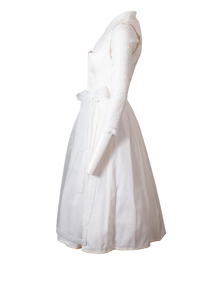Wunderschönes, sehr festliches Dirndl in zartem beige/creme. Geschlossen wird das Mieder-Oberteil mit Häckchen. Der Stoff des Oberteils ist in sich strukturiert gewebt. Eine beige Paspolborte ziert den eckigen Ausschnitt. Der in Falten gelegte Rock ist ebenfalls beige. Die Schürze ist ein Hauch von Stoff. Feines Tüll, sehr elegant. Der Rock ist mit einem weißen Baumwoll-Unterrock ausgestattet und hat Taschen. Mit diesem Dirndl fallen Sie bei jedem Fest ins Auge.