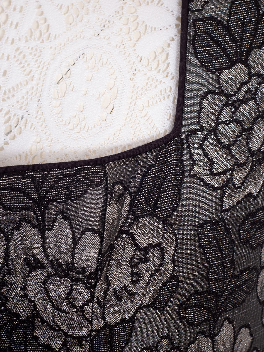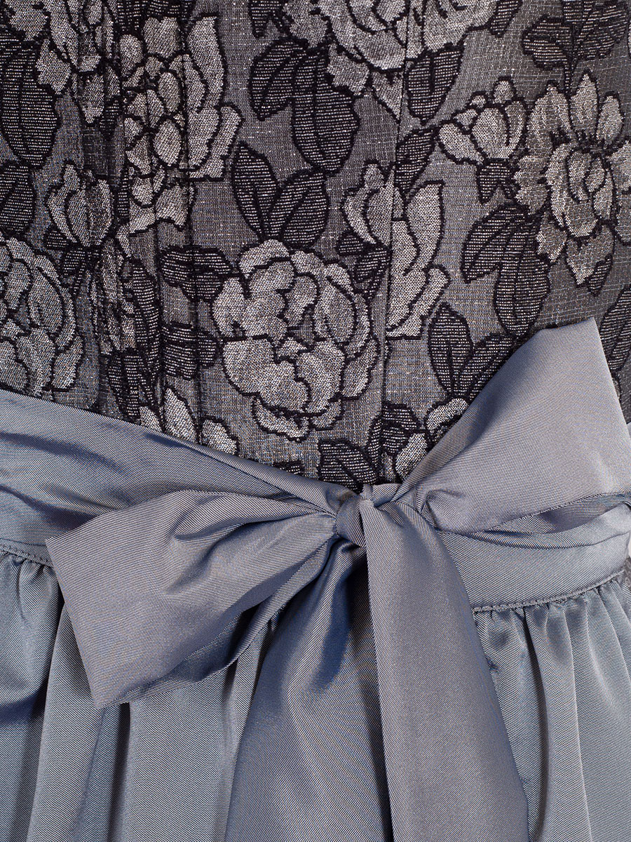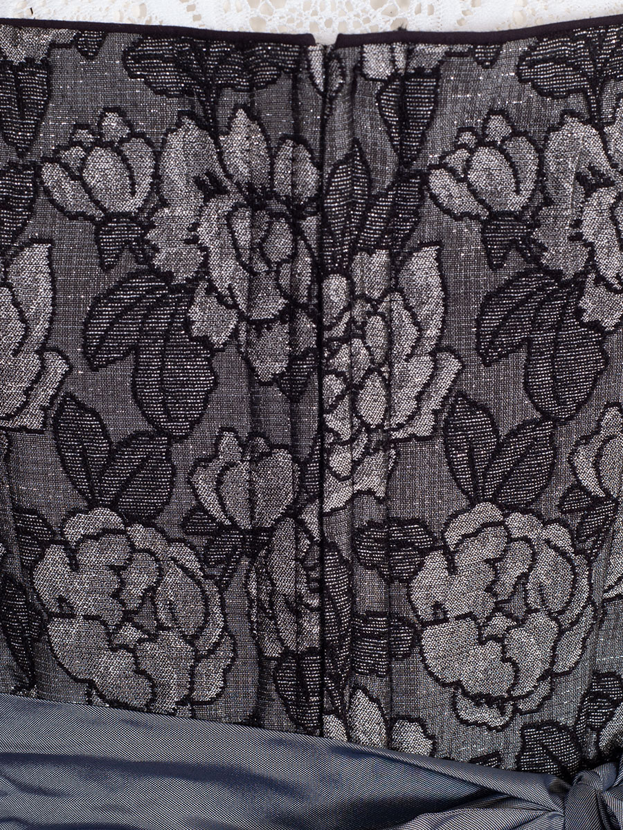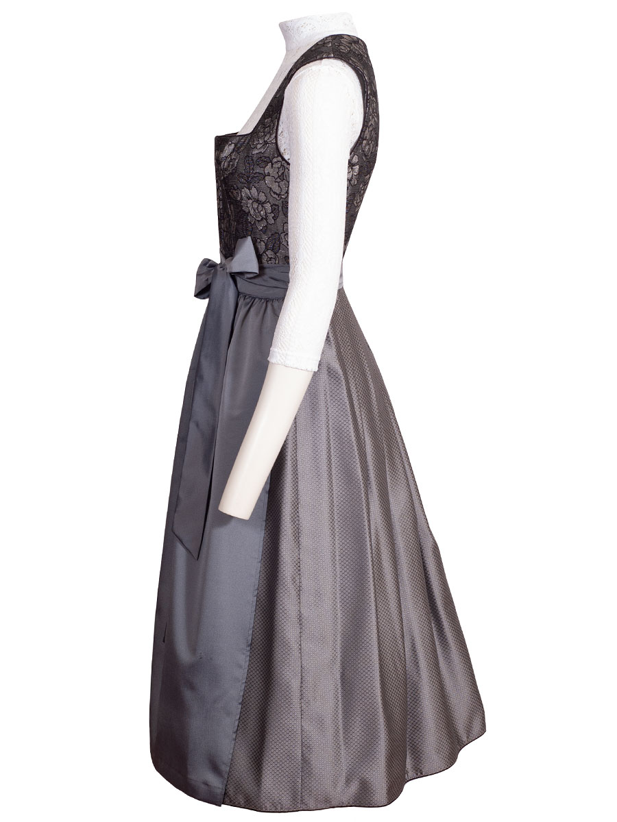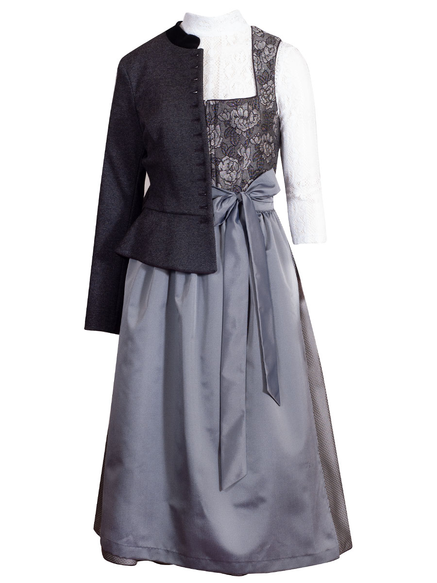 Wunderschönes, sehr festliches Dirndl in verschiedenen Grautönen mit Glitzer. Geschlossen wird das Oberteil mit Häckchen. Der Stoff des Oberteils ist in verschiedenen Grautönen mit Glitzer und Rosenmuster gewebt. Ein schwarzes Paspol Borte ziert den eckigen Ausschnitt und den Rockabschluss. Der in Falten gelegte Rock ist hellgrau gewebt mit regelmäßig strukturiertem Muster. Auch die Schürze setzt die Farbkombination fort. Sie ist einfarbig grau aus Trachtenseide. Der Rock ist mit einem weißen Baumwoll-Unterrock ausgestattet. Mit diesem Dirndl fallen Sie bei jedem Fest ins Auge.