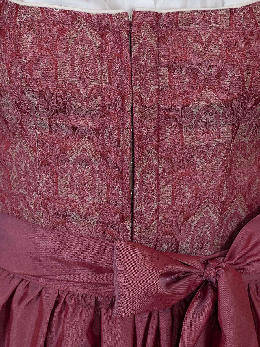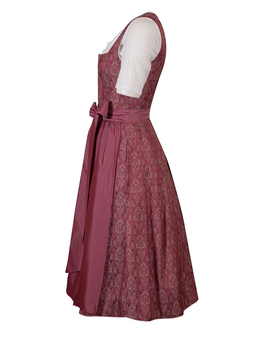 Wunderschönes, sehr festliches Dirndl in einem pink-beige gewebten, glänzenden Stoff. Geschlossen wird das Mieder-Oberteil mit Häckchen. Eine weiße Paspolborte ziert den eckigen Ausschnitt sowie den Rockabschluss. Die Schürze ist farblich passend ausgewählt und rundet unifarben pink das Kleid ab. Der Rock ist mit einem weißen Baumwoll-Unterrock ausgestattet und hat Taschen. Mit diesem Dirndl fallen Sie bei jedem Fest ins Auge.