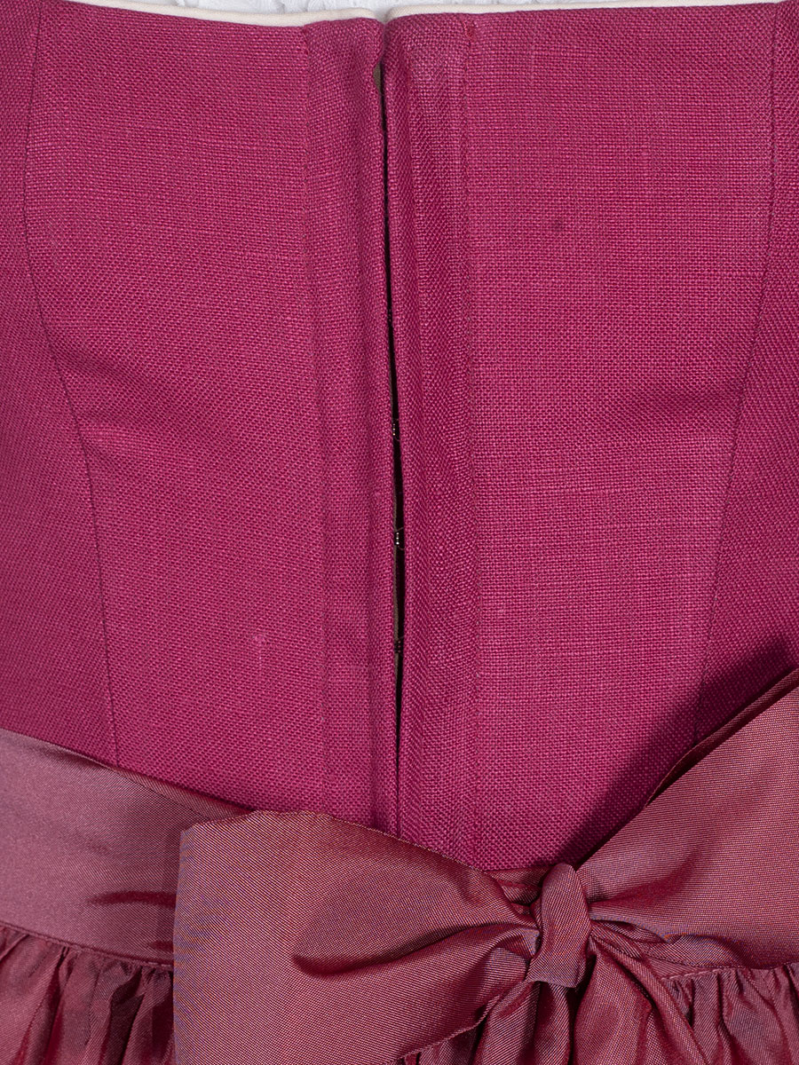 Elegantes und hochwertiges Dirndl von Alissa- by Kinga Mathe in frischem Pink. Das Leinenmieder wird mit einem Hackenverschluss geschlossen und ist am Ausschnitt weiß paspoliert. Der Rock ist mit Muster in sich gewebt und ist am Abschluss ebenfalls weiß paspoliert. Die einfarbige Schürze passt zum Gesamtbild und rundet das Wiesendirndl ab.