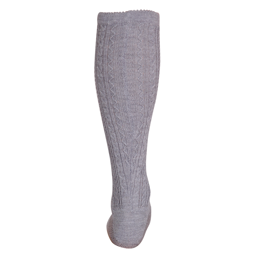 Kniestrumpf der Firma Lusana in der Farbe grau. Der Strumpf ist mit Zopfmuster gestrickt und passt zu jeder kurzen Lederhosen oder Kniebundlederhosen. Der Trachtenstrumpf wurde auf der Handstrickmaschine gefertigt.