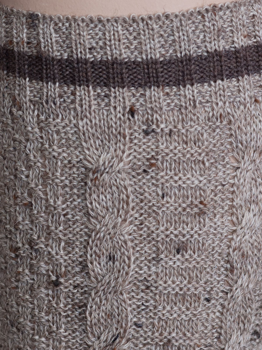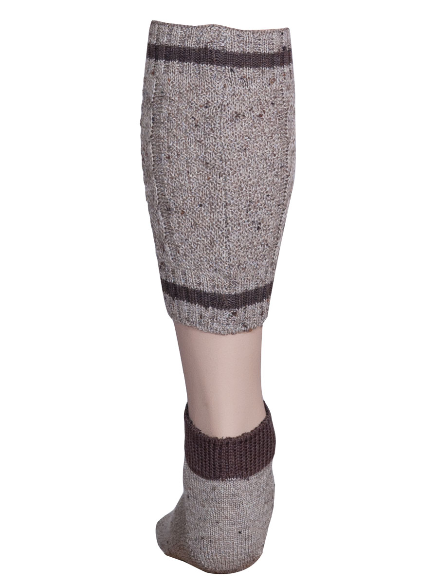 Klassische Loferl mit Zopfmuster in der Farbe braunmeliert ohne Umschlag. Zum Loferl gehören Füßlinge in der gleichen Farbe. Die Ränder der Füßlinge und der Loferl sind braun eingefasst.