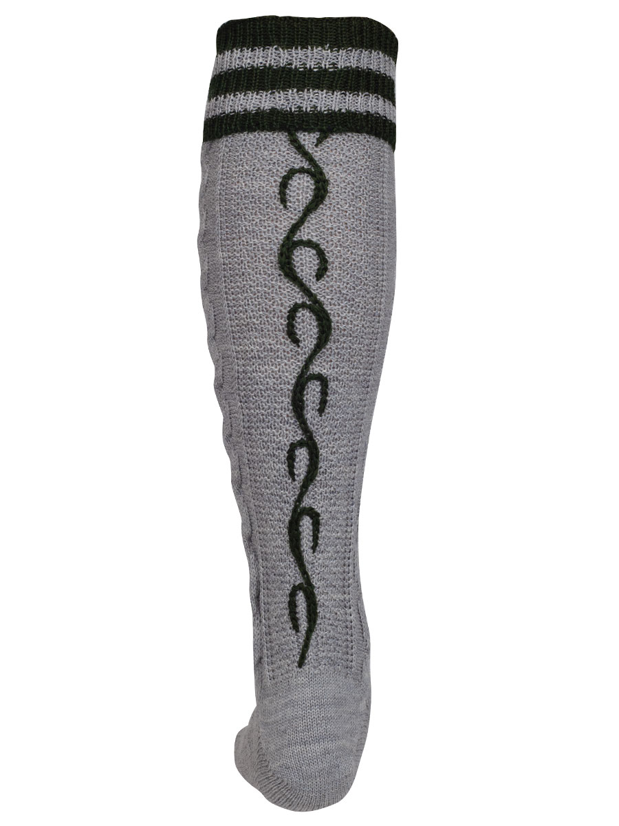 Trachtiger Umschlagstrumpf der Firma Lusana in der Farbe hellgrau mit Zopfmuster. Der Kniestrumpf hat einen grünen Umschlag und passt zu jeder kurzen Lederhose oder Kniebundlederhose.