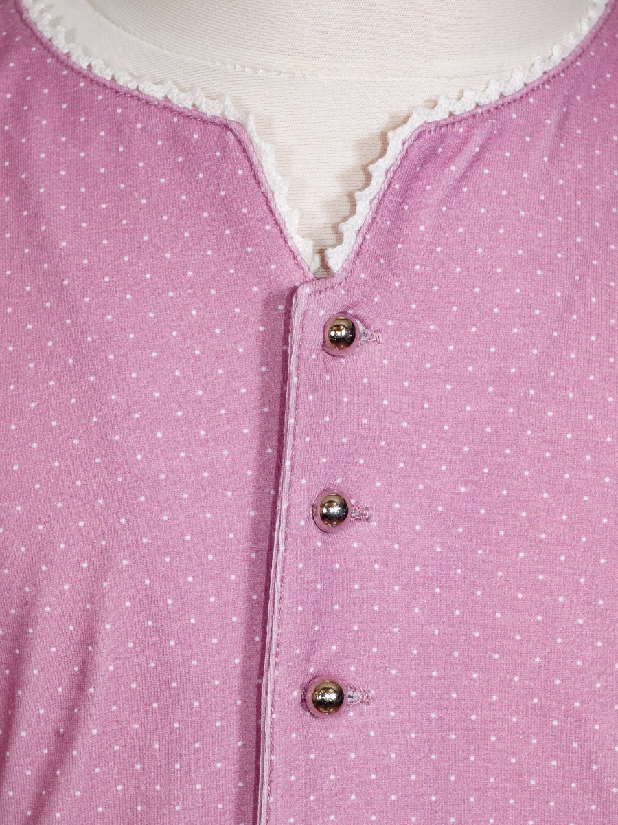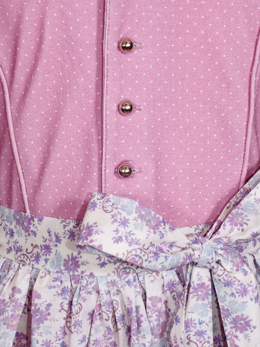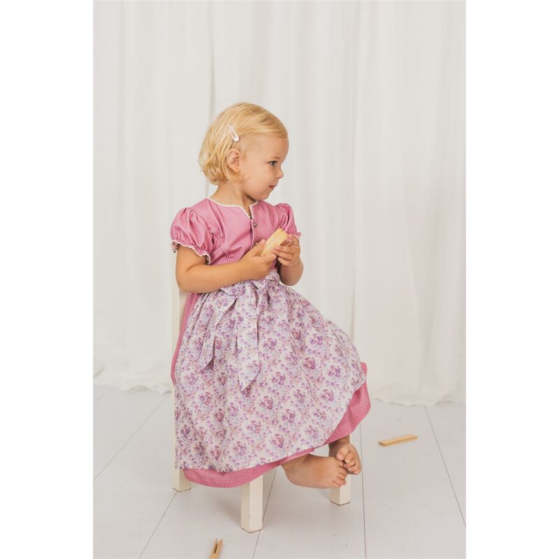 Bezauberndes Dirndlkleid aus Baumwolljersey für Mädchen der Firma Mogo. Das rosafarbene Kleid ist mit weißen Pünktchen bedruckt und passt sich durch den elasthischen Stoff wunderbar an. Das Dirndl wird vorne mit kleinen Kugelknöpfen geschlossen. die geblümte Schürze ist aus Gewebematerial.