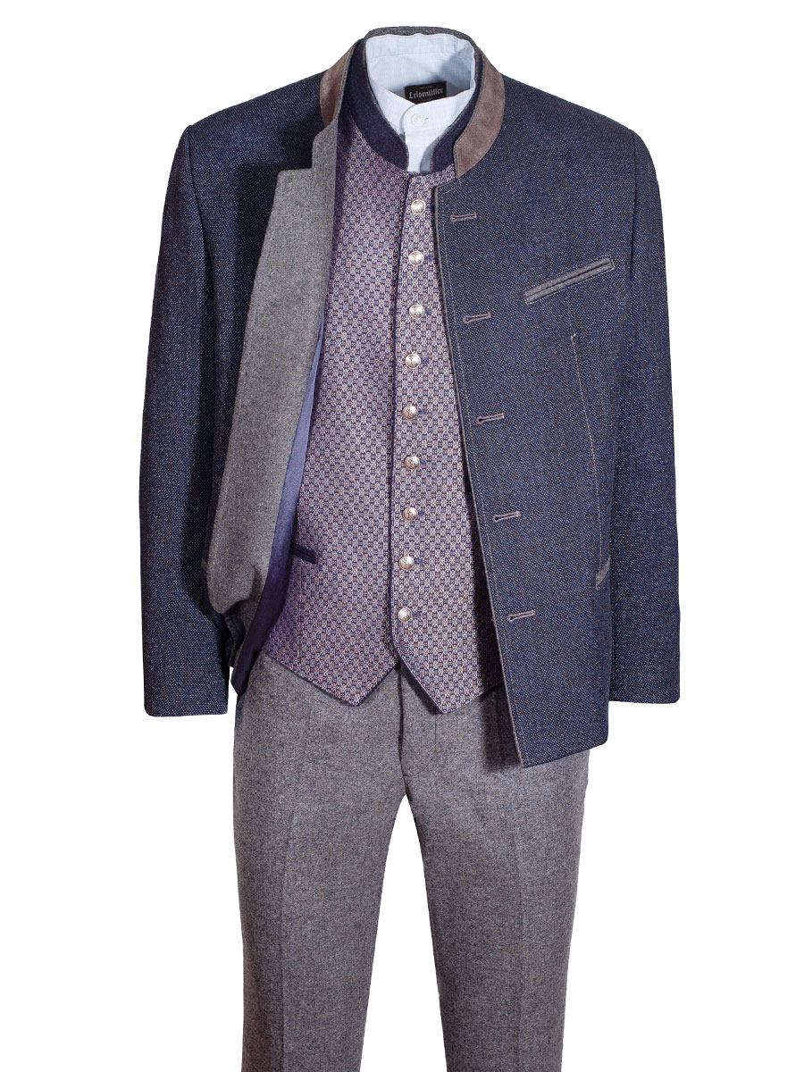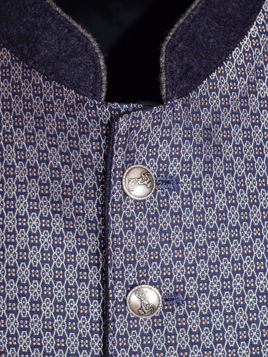 Festlich glänzende Trachtenweste in marineblau gewebten Stoff der Firma Schloß Orth. Der schwarzen Rücken kann mit einem Riegel in der Weite verstellt werden. Insgesamt hat die Trachtenweste links eine Brusttasche, links und rechts eine Einstecktasche sowie Innentaschen. Der Stehkragen ist in marineblauem Loden gearbeitet.