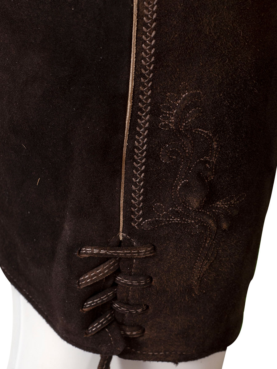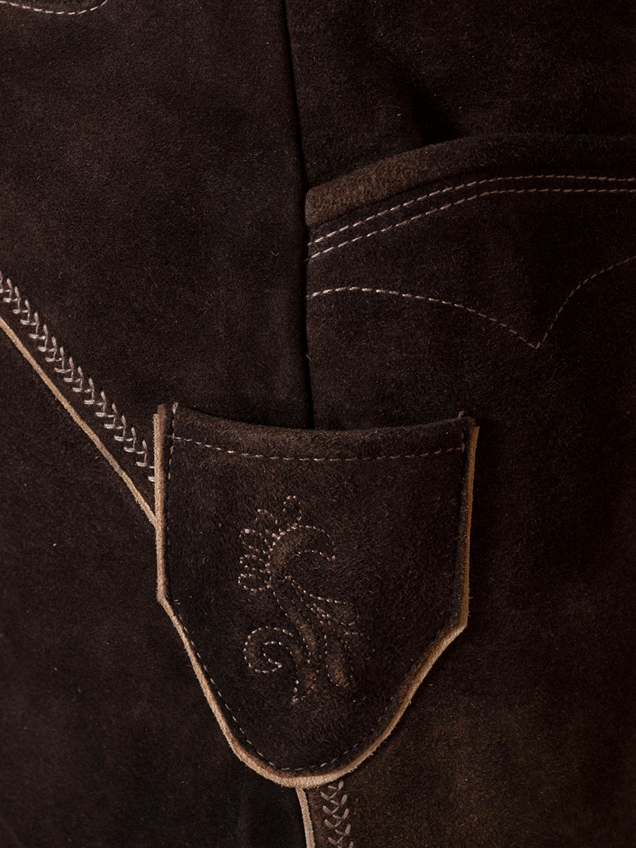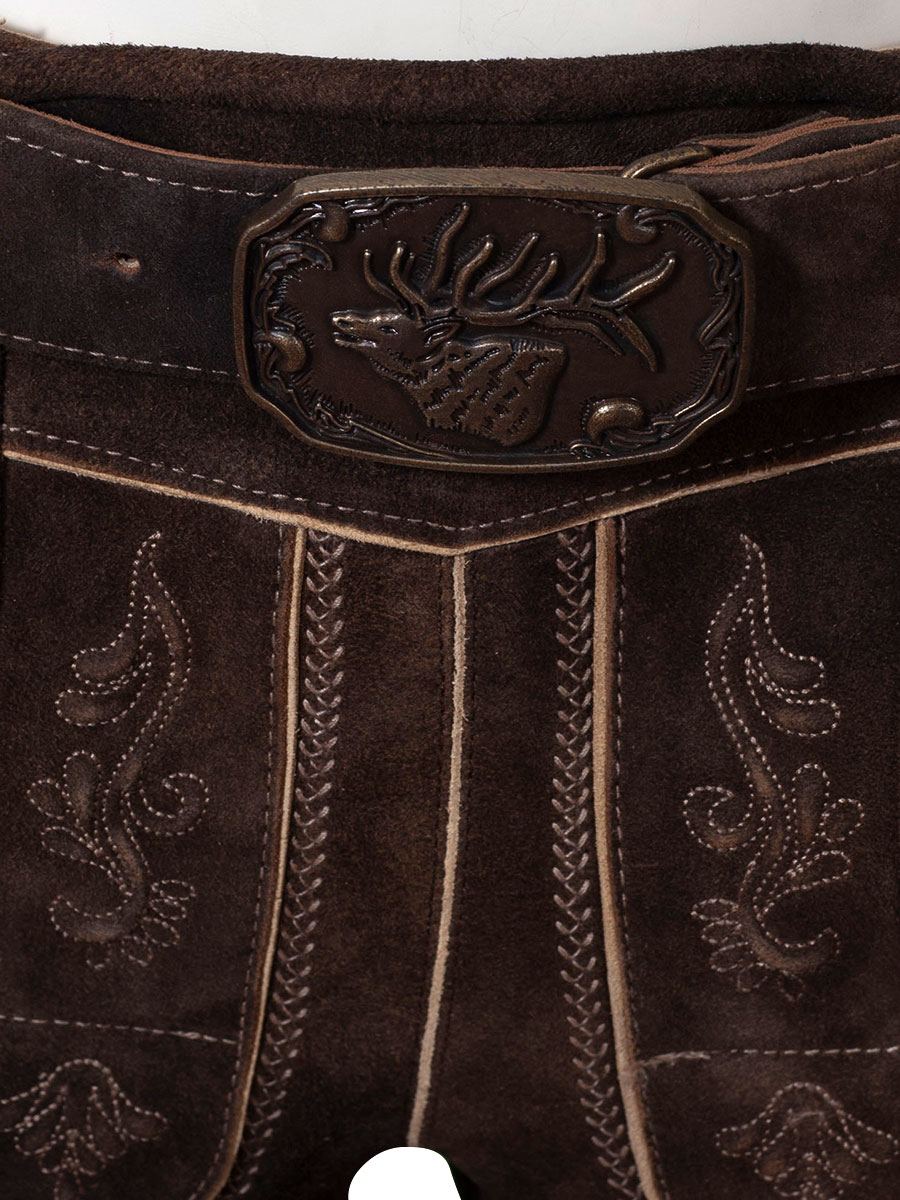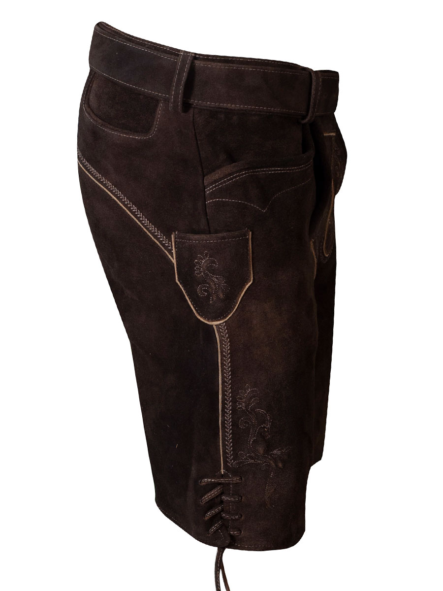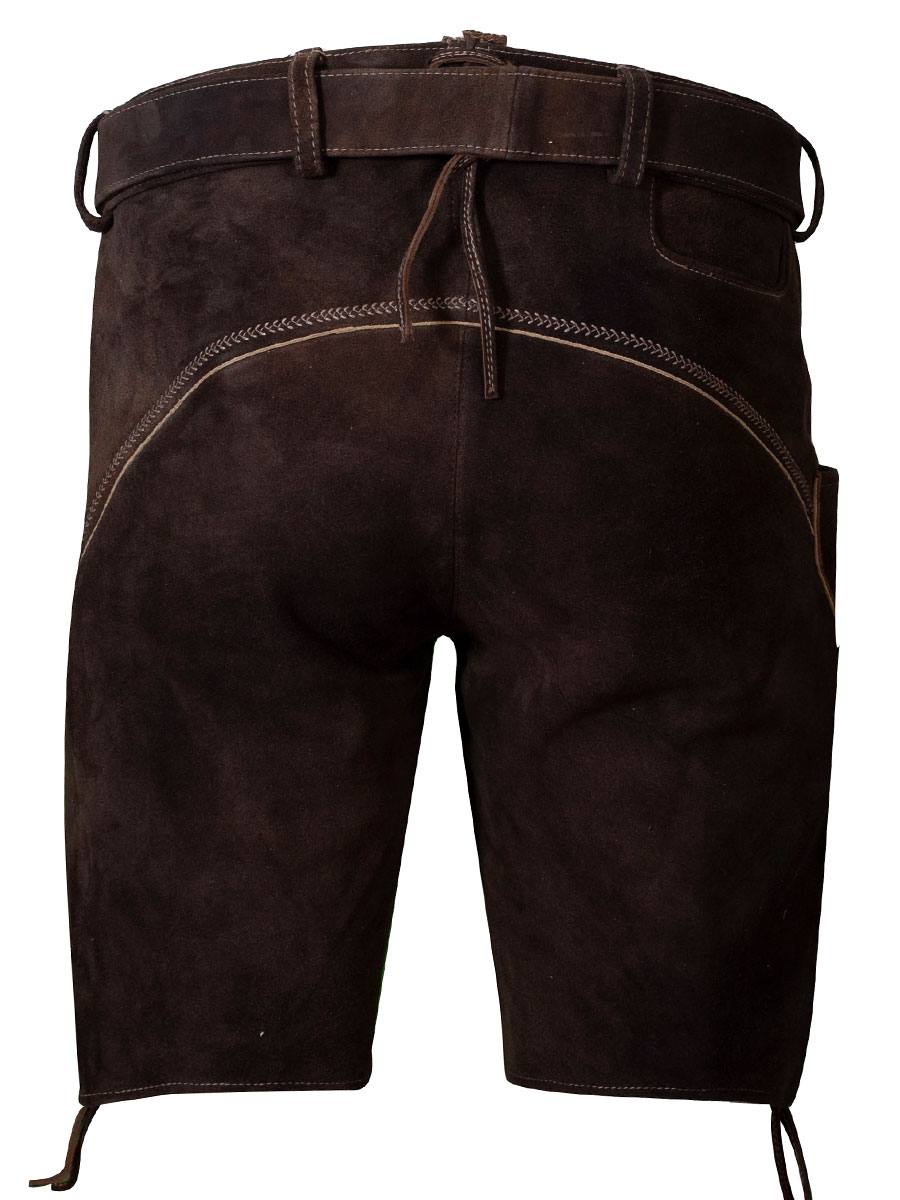 Diese kurze Lederhose ist aus Wildbockleder in der Farbe nutria-braun gefertigt. Die Hose ist mit hellen Stickerei am Latz, an den Beinen und an der Messertasche verziert. Die Gesäßtasche wird mit einem Hirschhornknopf geschlossen. Die Kurze ist am Bund verstellbar und wird mit einem Gürtel geliefert. Der Gürtel hat eine aufwendige Schnalle mit einem Hirschkopf. Der Beinabschluss wird mit braunen Lederbändern geschlossen.