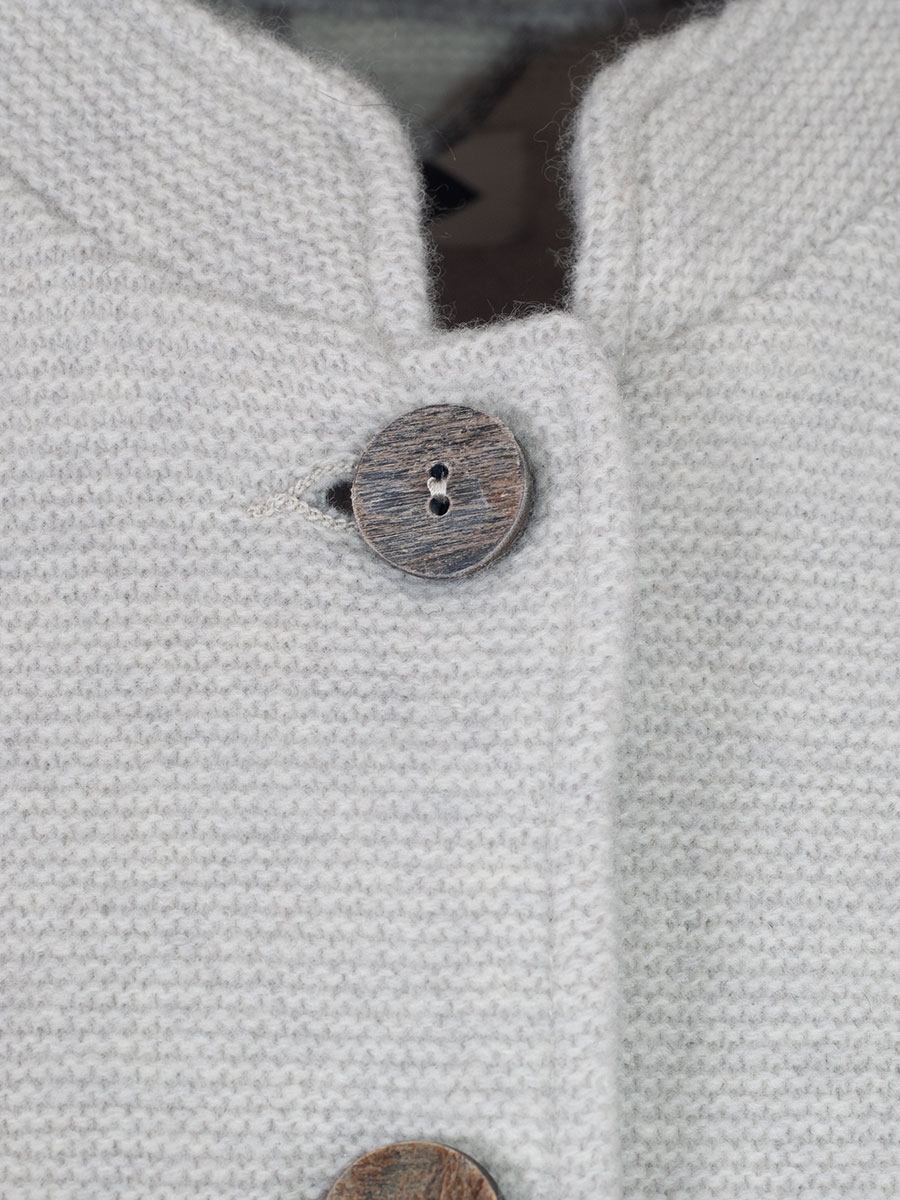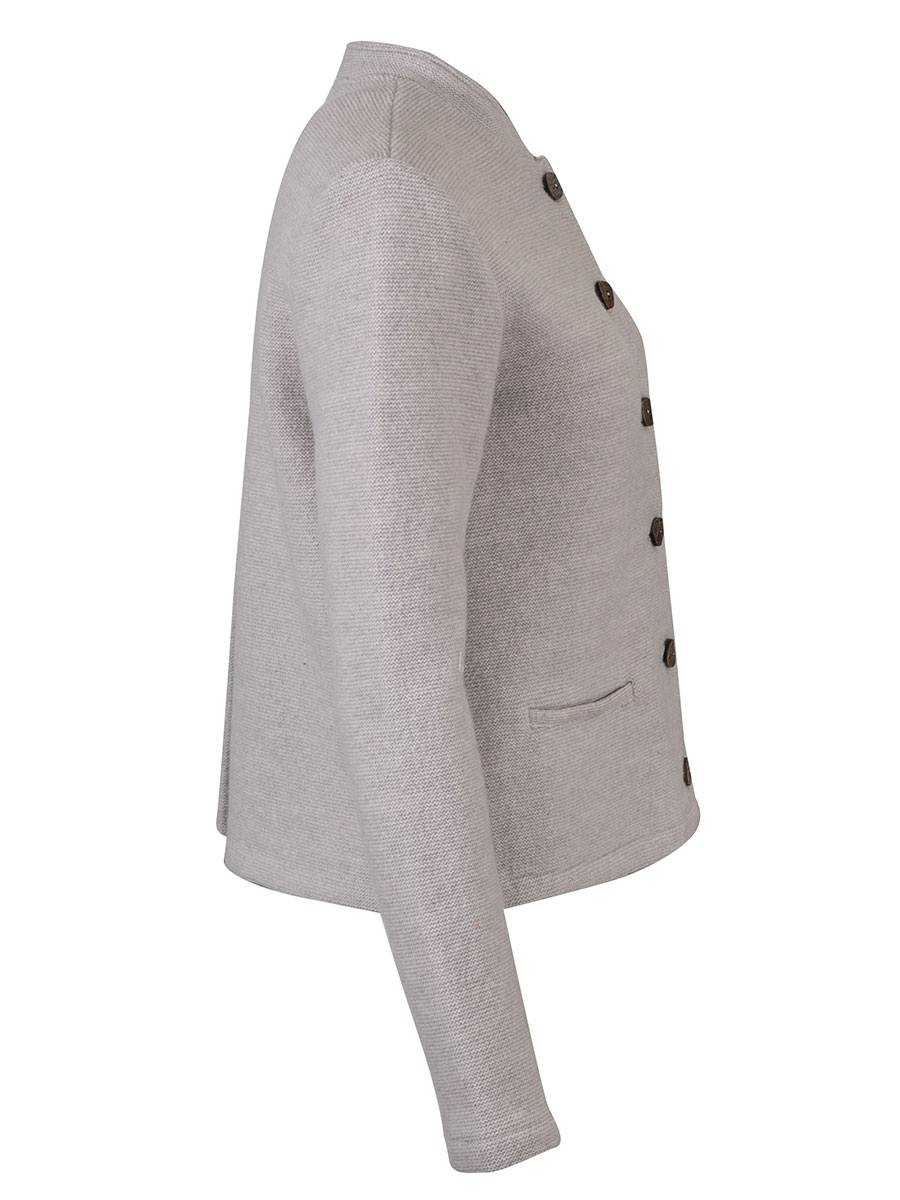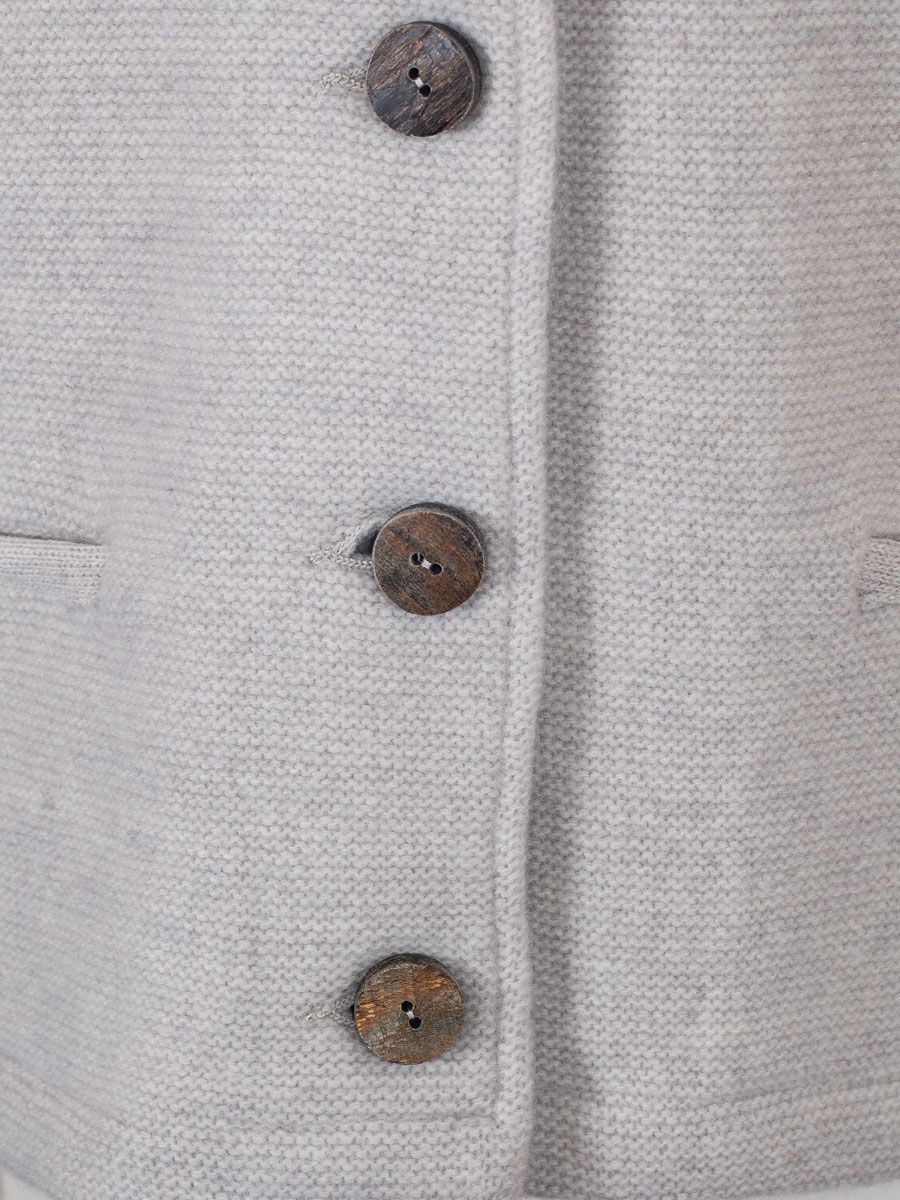 Die ecrufarbene Damen Strickjacke Marie der österreichischen Firma STAPF ist gerade geschnitten und kann sowohl zu Hose als auch zu einem Rock getragen werden. Die hochwertige Damenjacke hat einen kleinen Stehkragen, der innen grau unterlegt ist und auf beiden Seiten eine kleine Einschubtasche. Geschlossen wird die Trachtenjacke mit großen Holzknöpfen. Die Rückenfalte werte die Jacke zusätzlich optisch auf. Dieses hochwertige Kleidungsstück wird von Hand in Österreich gefertigt.