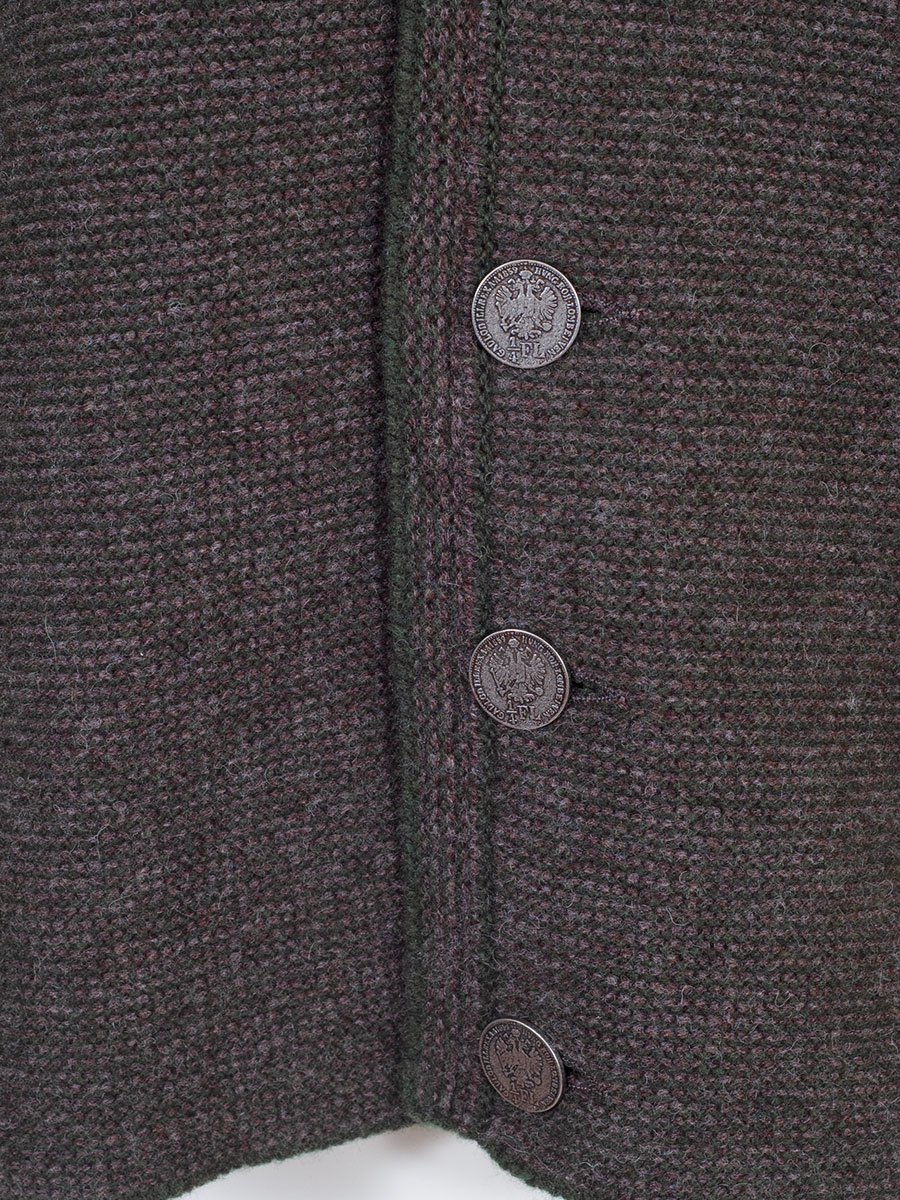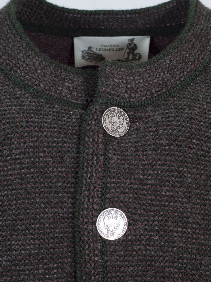 Aus unsere Kollektion "hausg'macht" - sportliche Herrenstrickjacke der bayerischen Qualitätsfirma Astrifa. Die Strickjacke ist aus brauner Wolle mit grünen Abschlüssen. Die Vorderseite der Herrenjacke ist braun-grün meliert angesetzt, ebenso der kleine Kragen. Geschlossen wir die Trachtenjacke mit wunderschönen, silbernen Talerknöpfen.