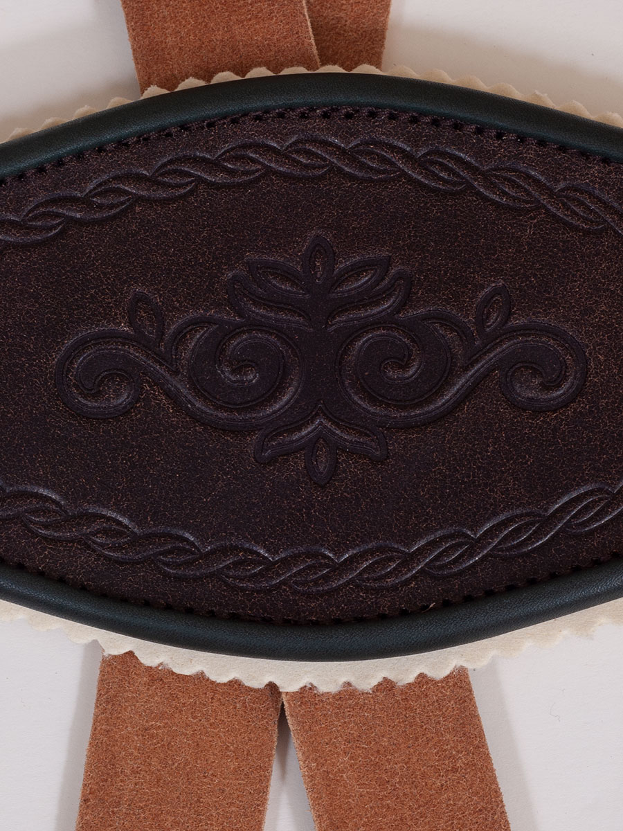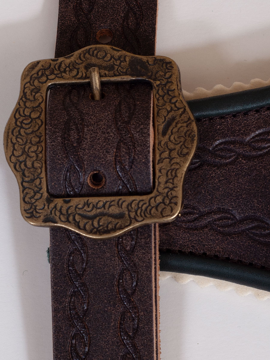 Ein klassischer Stegträger in der Farbe dunkelbraun aus glattem Rindsleder. Der Trachtenträger hat bronzefarbene Schließen. Die Längen sind verstellbar. Das Leder des Mittelteils und der Träger ist geprägt. Zusätzlich ist der Steg mit hellen Lederzacken unterlegt und mit einem grünen Lederpaspolrand versehen.