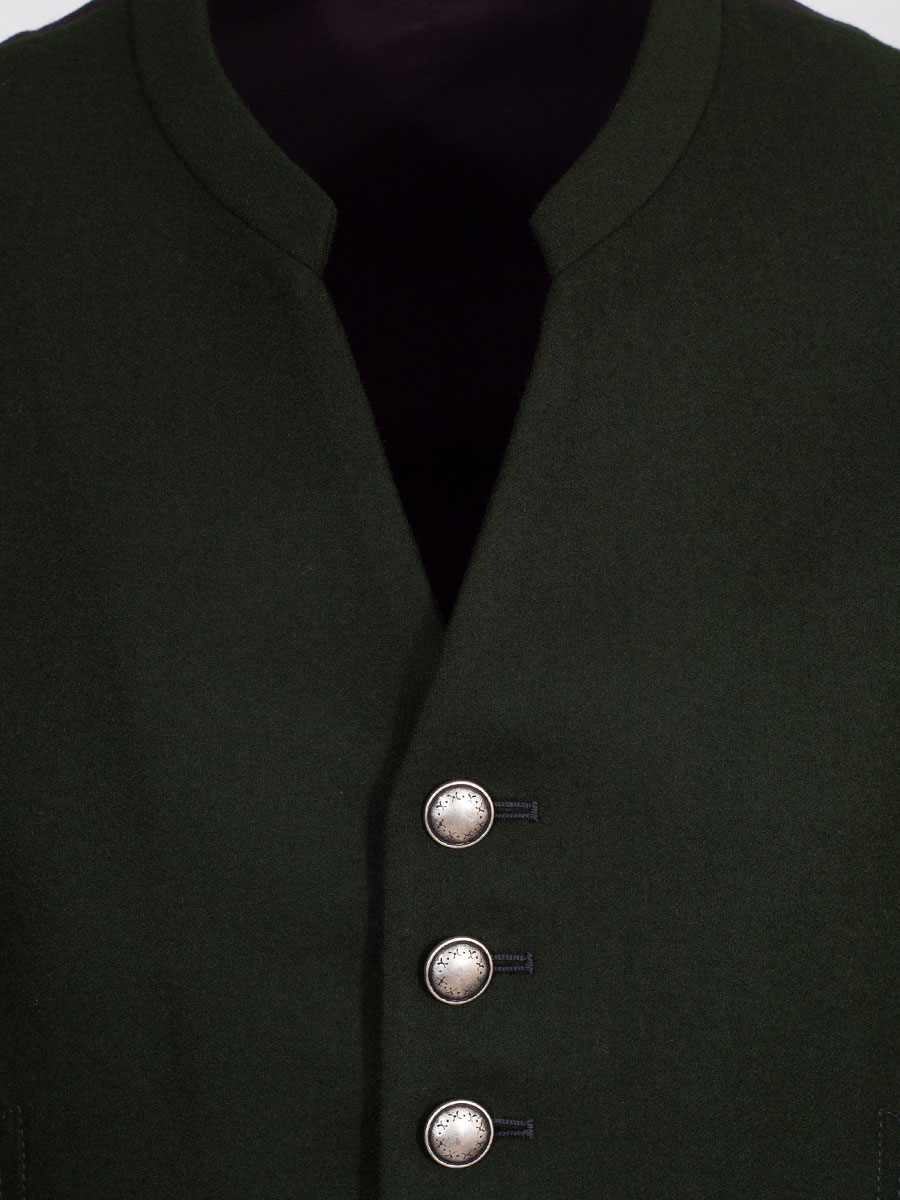 Elegante, klassische Trachtenweste in tannengrün. Die Weste hat einen kleinen Stehkragen und wird mit gemusterten Silberknöpfen geschlossen. Beide Taschen sind grüne Paspolaschen. Zusammen mit einem eleganten Lodenjanker oder einem Trachtensakko kann die Weste auf Lederhose, Trachtenhose oder Jeans getragen werden. Der schwarze Rücken hat einen Riegel zum Verstellen der Weite.