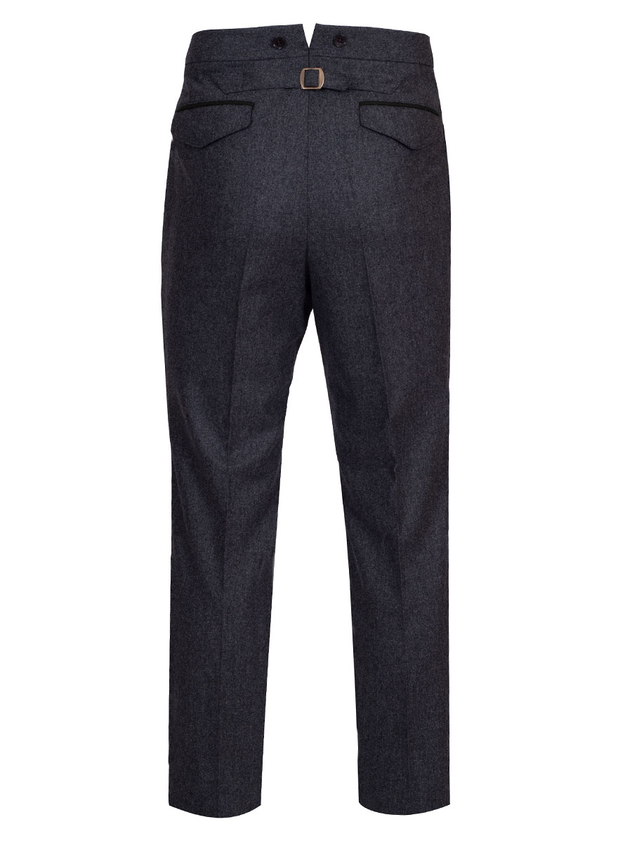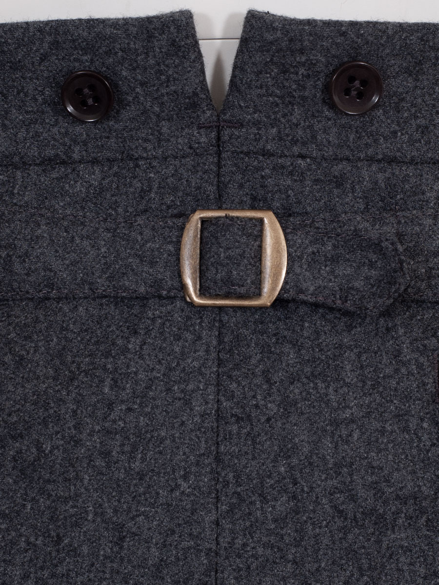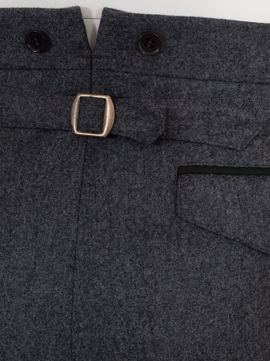 Hochwertig verarbeitete Lodenhose. Die Herrenhose in grau hat eine seitliche, grüne Paspolnaht. Die Trachtenhose ist mit Gürtelschlaufen ausgestattet und hat rechts und links sowie auf beiden Seiten des Gesäß grün paspolierte Taschen. Hinten ist die Trachtenhose höher geschnitten und kann mit einem Riegel verstellt werden. Für Hosenträger sind Knöpfe vorhanden.