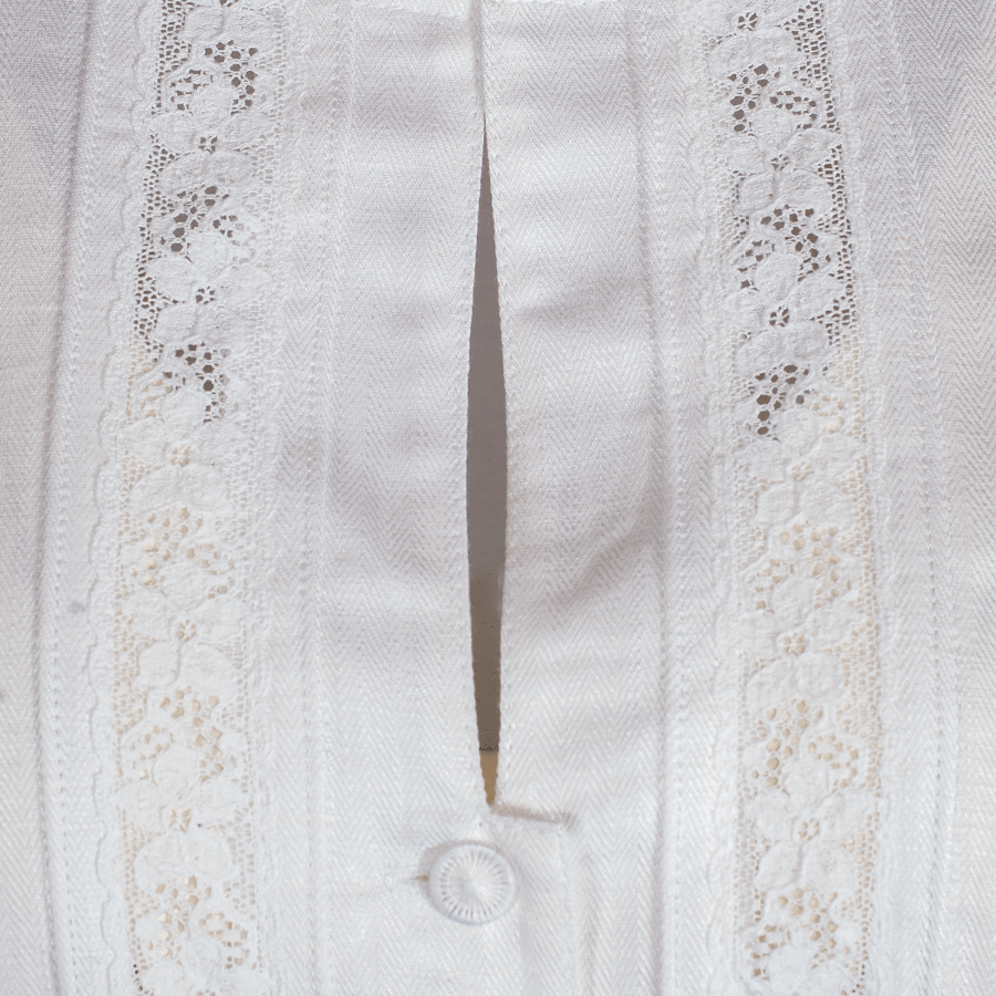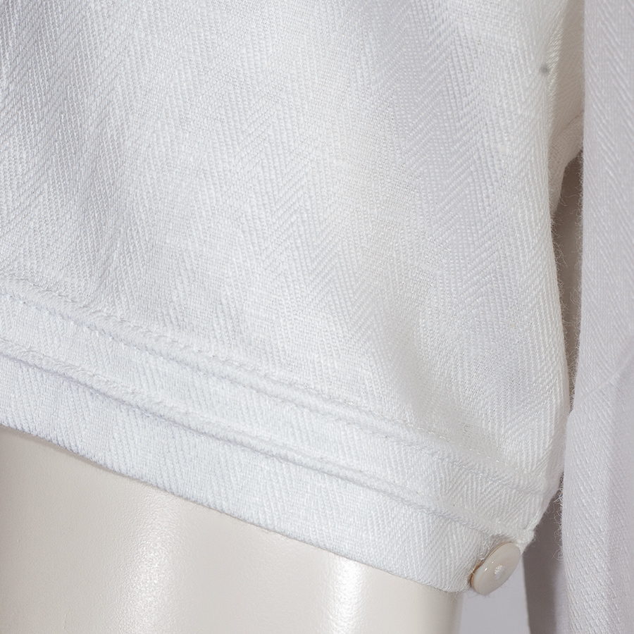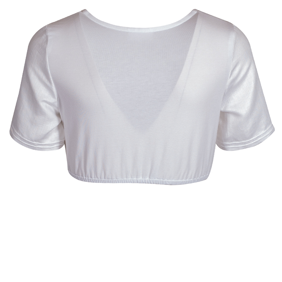 Sommerliche Dirndlbluse der Firma Waldorff. Die Vorderseite ist aus Leinenstoff genäht, die Rückseite dagegen aus Baumwolle. Entlang der Knopfleiste verlaufen auf beiden Seiten eine Spitzenborte und Biesen. Der Ausschnitt wird mit einem Hacken geschlossen. Ein Gummizug sorgt für einen rutschfesten Sitz.