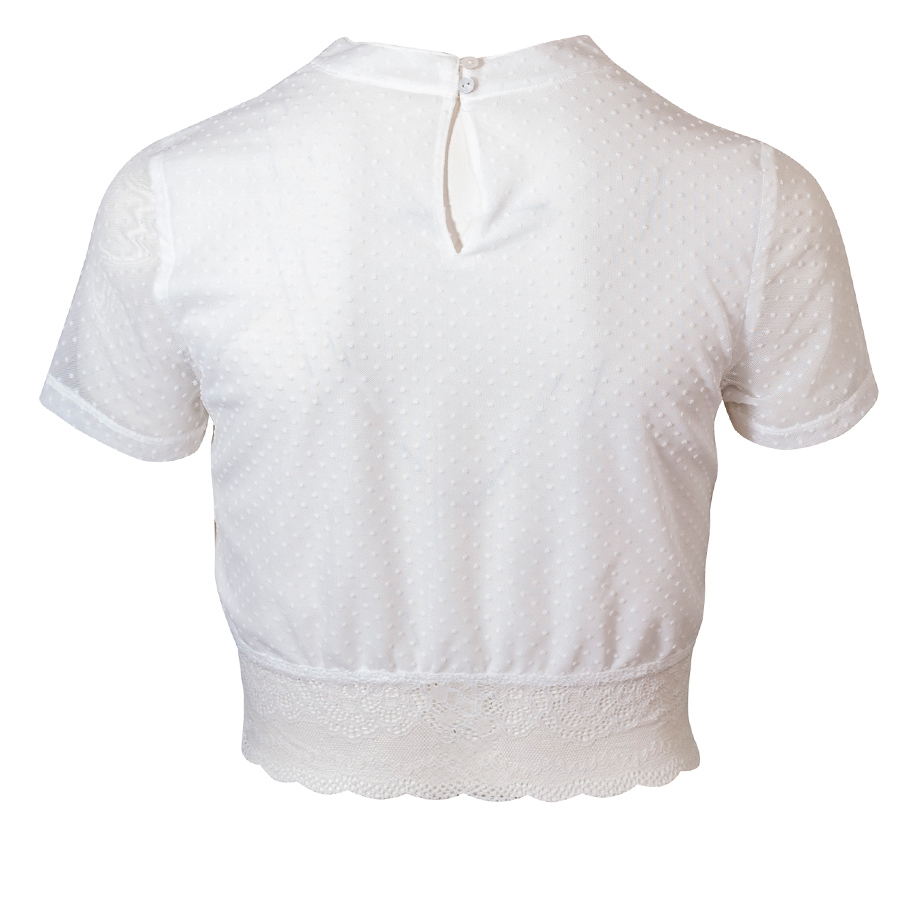 Sehr elegante Dirndlbluse der Firma Waldorff mit kurzen Armen. Diese Bluse wird über Kopf angezogen und hat einen hübschen breiten Spitzenbund. Auch der Rest der Bluse ist überwiegend aus Spitz. Die Vorderseite ist mit einem Futterstoff unterlegt. Der Kragen wird im Nacken mit einem Knopf geschlossen. Mit dieser Bluse sehen Sie in jedem Dirndl elegant und festlich aus.