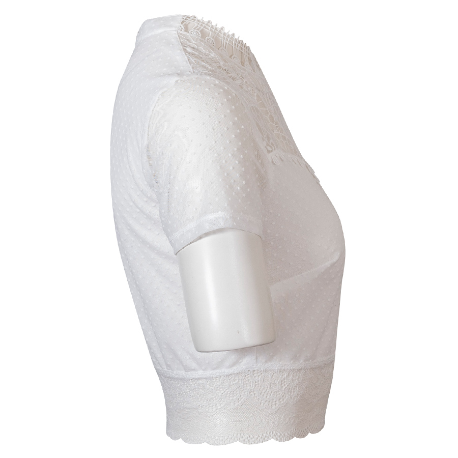 Waldorff Dirndlbluse, weiß, elegant, breiter Spitzenbund, hochgeschlossen, Kurzarm