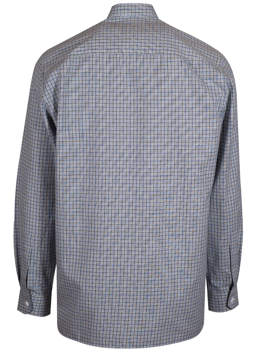 Kariertes Trachtenhemd der Firma Waldorff in Blau und Grün mit Stehkragen. Das Herrenhemd ist als Pfoad mit Riegel gearbeitet und wird Wäscheknöpfen geschlossen. Der Rücken ist glatt gearbeitet.
