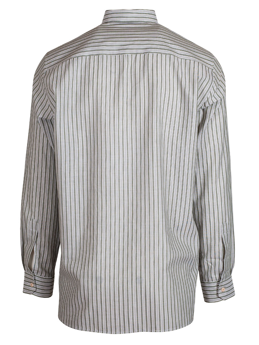 Gestreiftes Trachtenhemd der Firma Waldorff in Grün und Weiß mit Liegekragen. Das Herrenhemd ist als Pfoad mit Riegel gearbeitet und wird mit kleinen, beigen Knöpfen geschlossen. Der Rücken ist glatt gearbeitet.