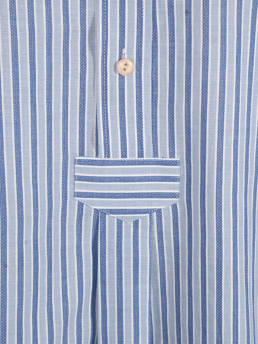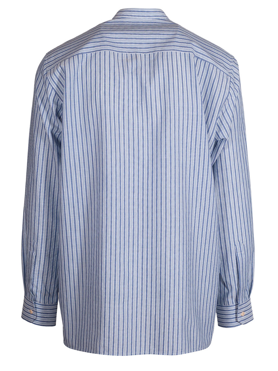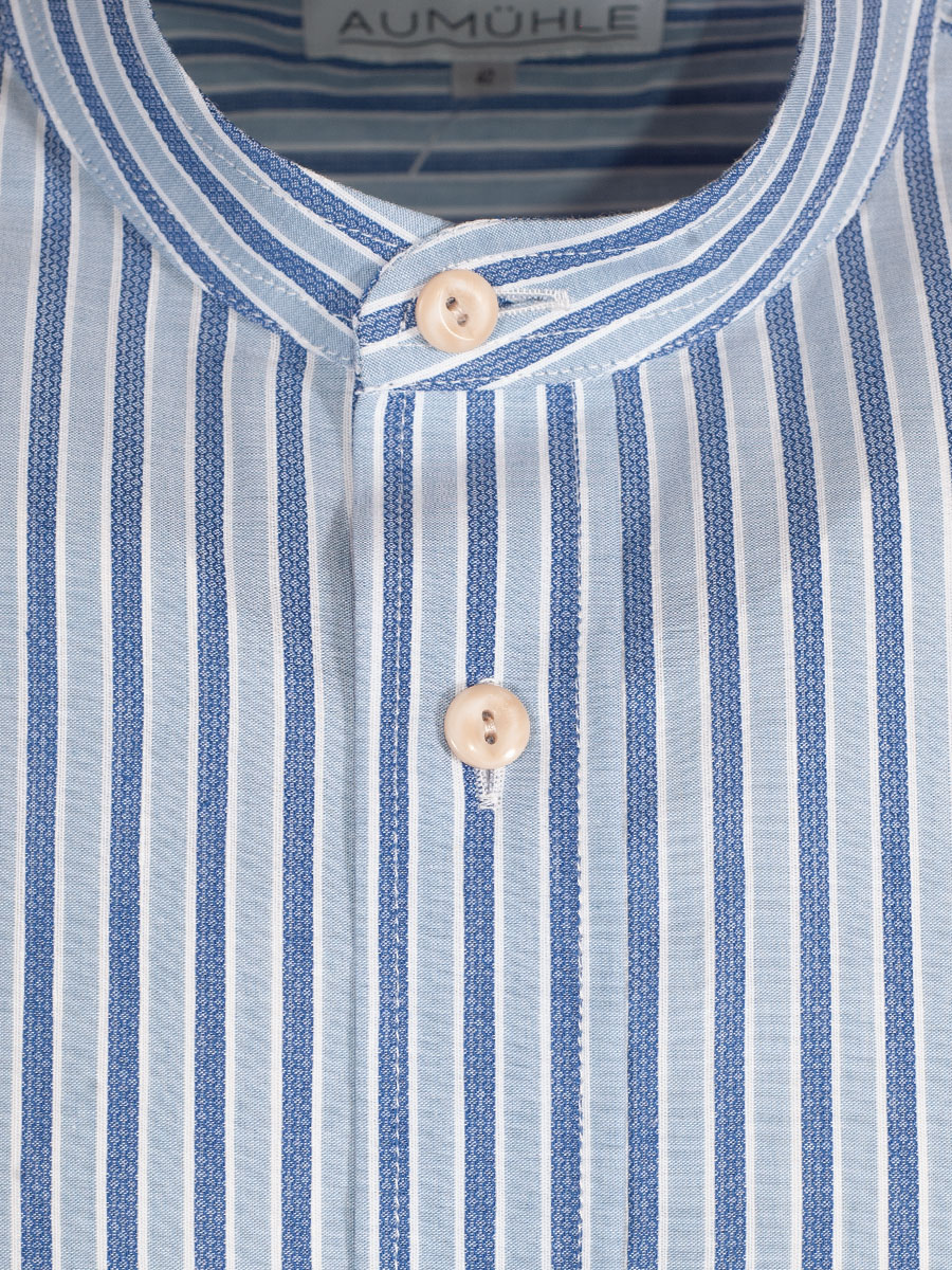 Gestreiftes Trachtenhemd der Firma Waldorff in Hallblau, Blau und Weiß mit Stehkragen. Das Herrenhemd ist als Pfoad mit Riegel gearbeitet und wird mit kleinen, beigen Knöpfen geschlossen. Der Rücken ist glatt gearbeitet.