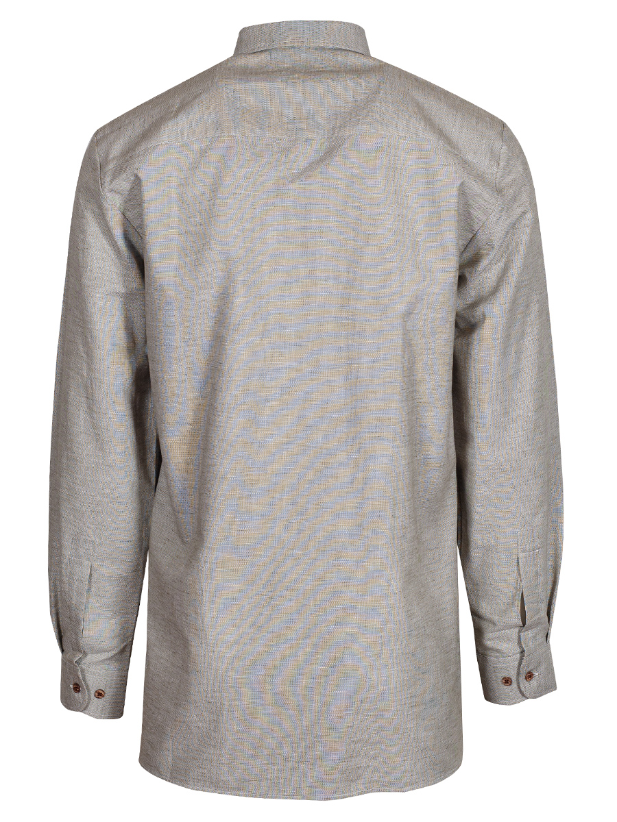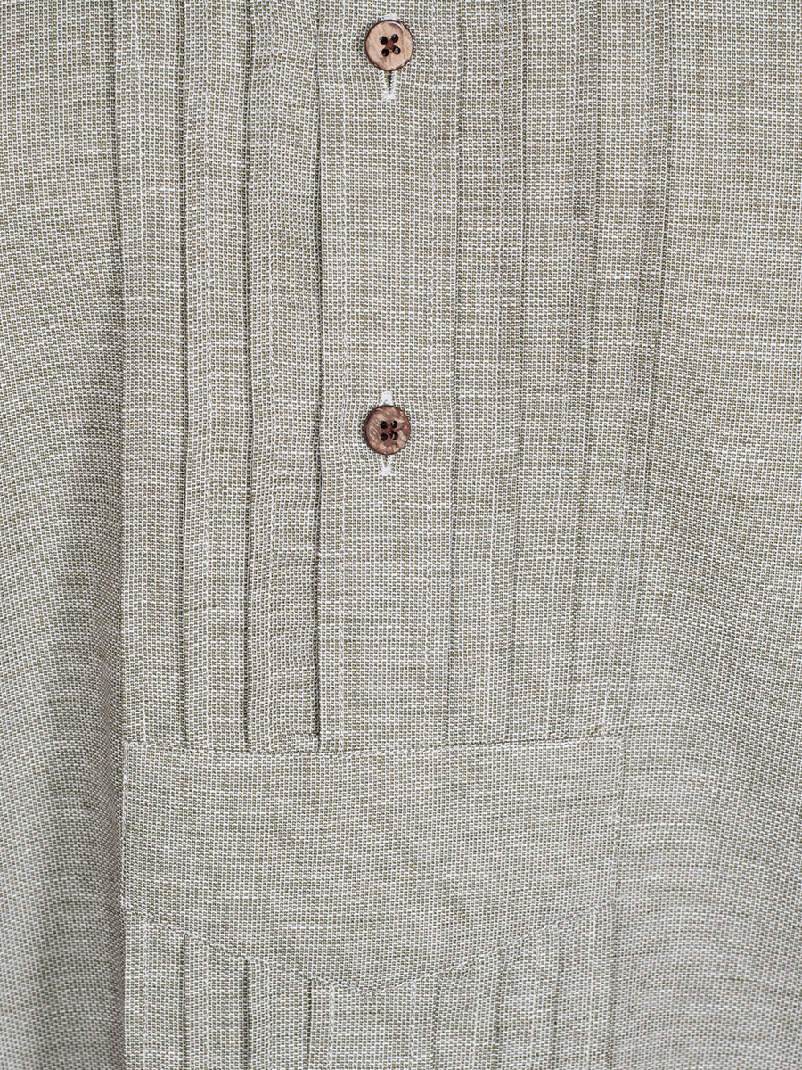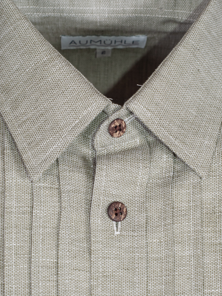 Hellgrünes Trachtenhemd der Firma Waldorff aus einer Leinen-Baumwollmischung mit Liegekragen. Das Herrenhemd ist als Pfoad mit Riegel gearbeitet und wird mit kleinen Holzknöpfen geschlossen.