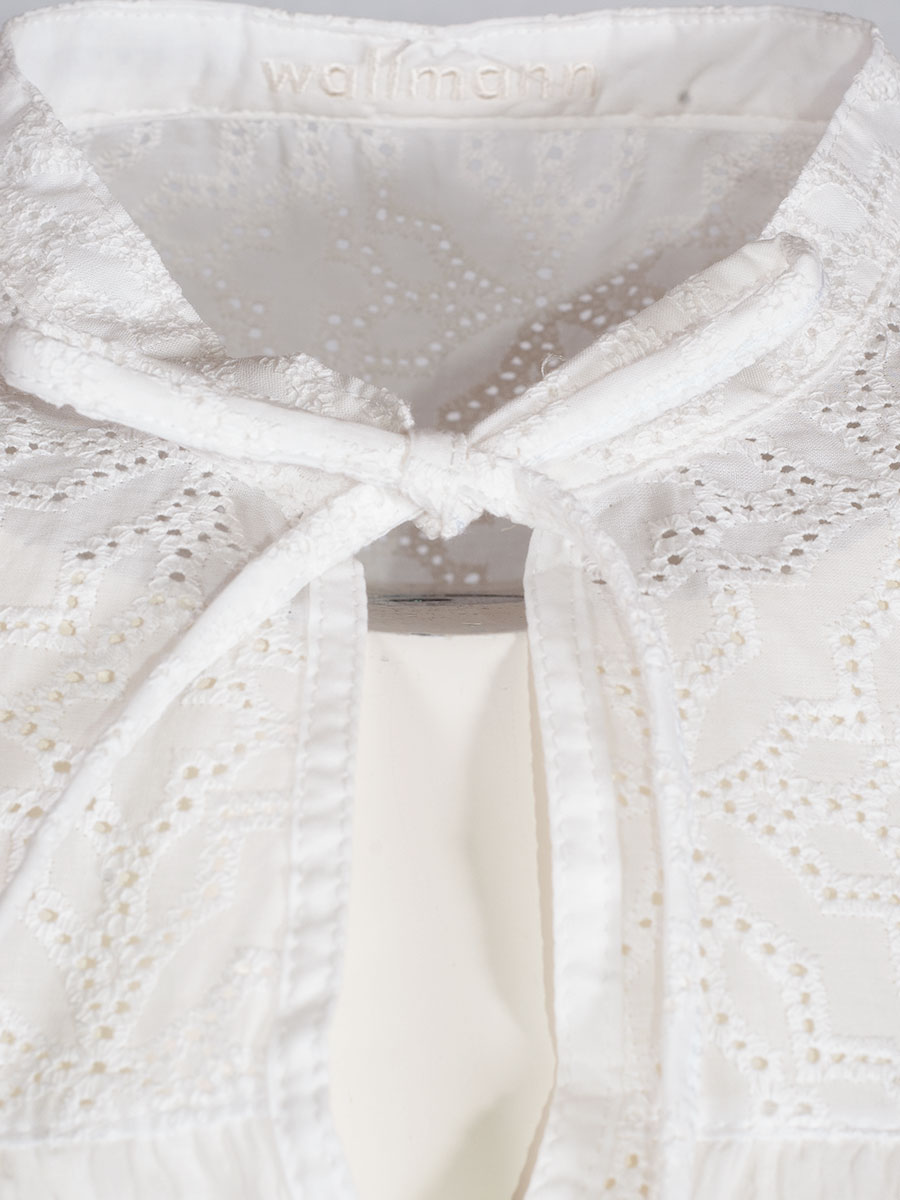Hübsches Sommertop der Firma Wallmann mit Lochmuster. Die luftige Bluse ist hochgeschlossen und hat einen kleinen Stehkragen. Dieser wird mit einer Schleife geschlossen.
