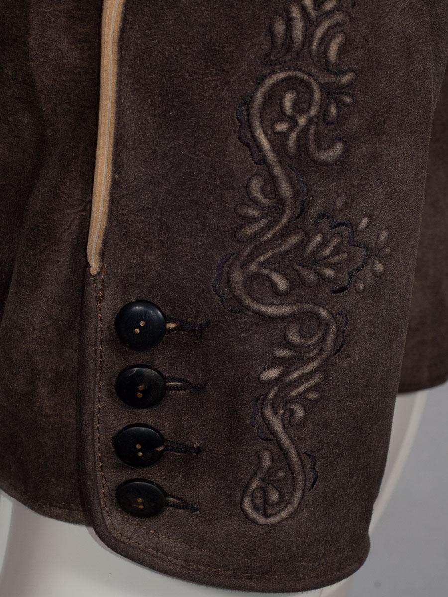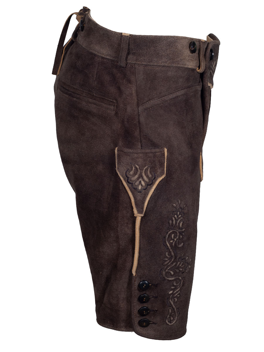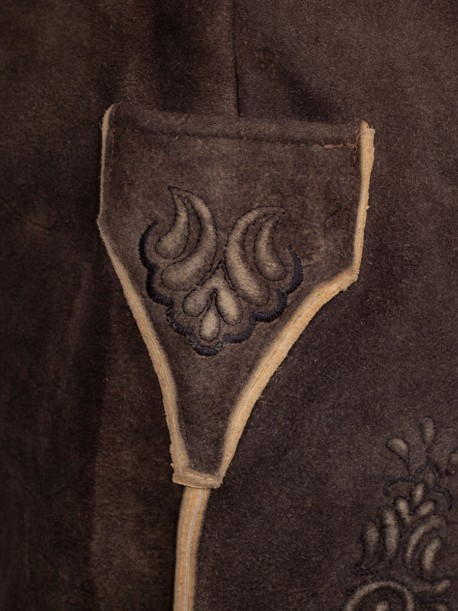 Hochwertige, kurze Lederhose aus Ziegenvelour im ahornbraun. Latz, Messertasche und Beine sind mit Plamastick und schwarzer Stickerei verziert.