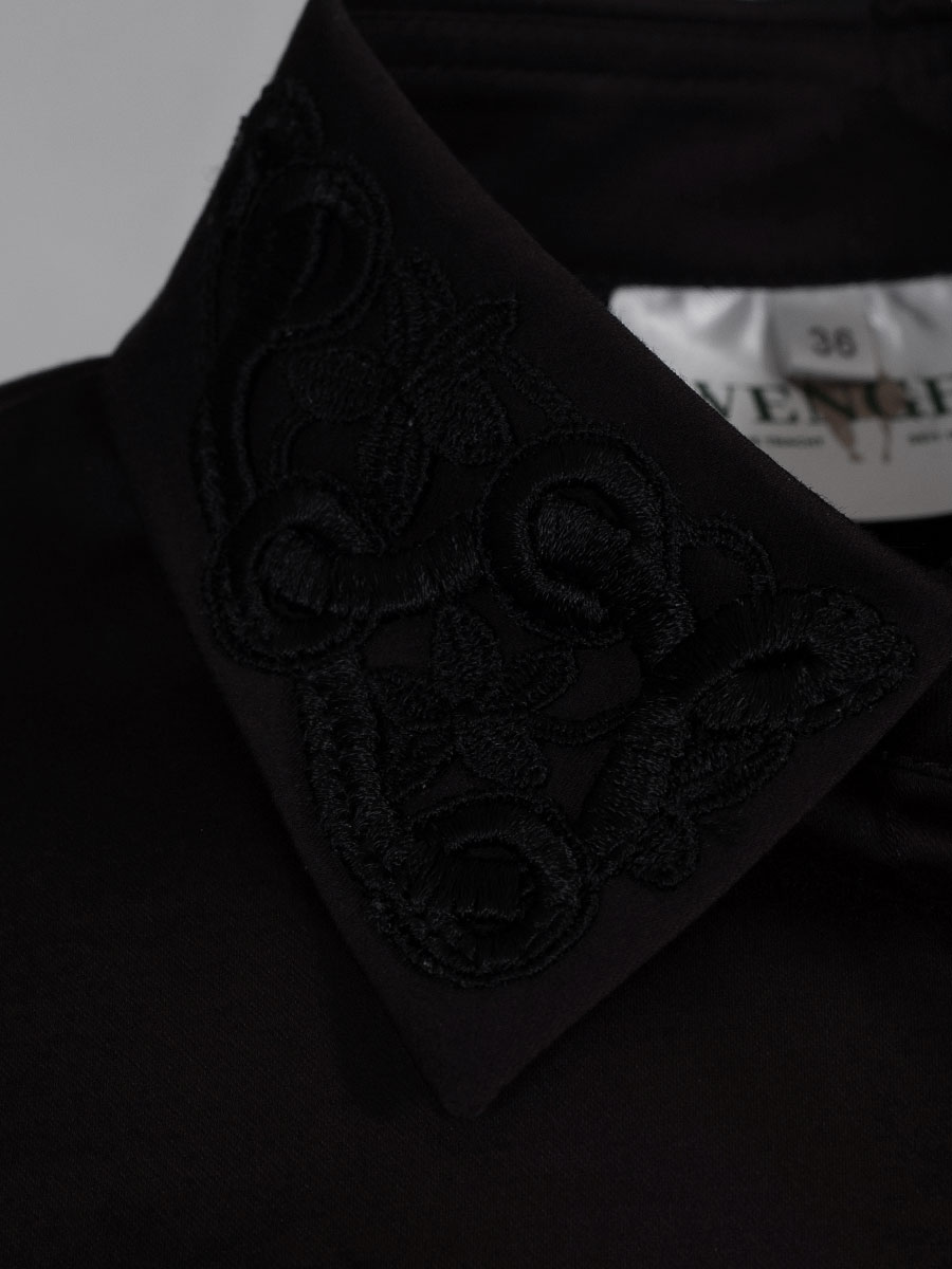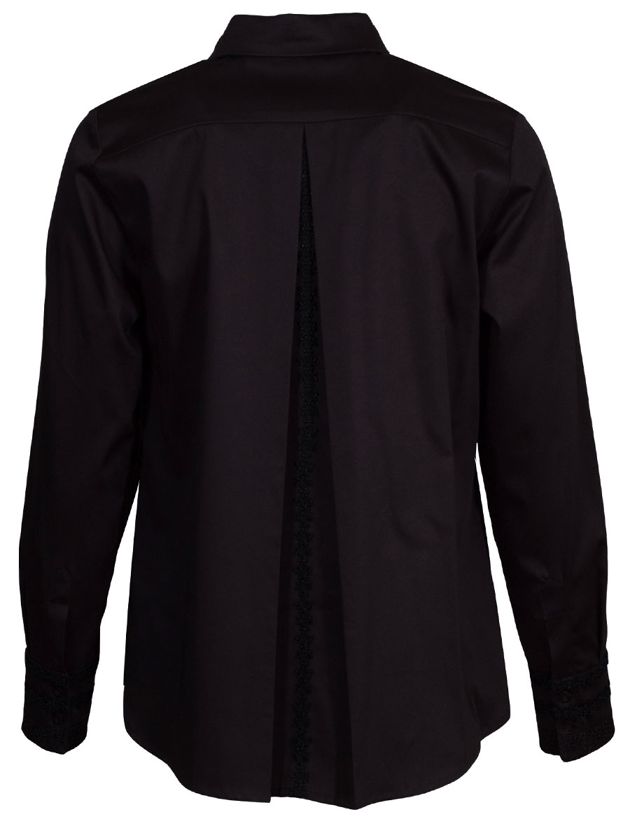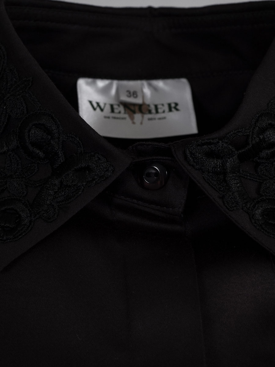 Elegante, schwarze Damenbluse mit langen Armen der Firma Wenger. Durch den Stretchanteil lässt sich die Bluse sehr angenehm tragen. Auf den breiten Manschetten an den Armabschlüssen sind schwarze Spitzenborten aufgenäht. Der Kragen ist ebenfalls auf der Vorderseite der Bluse mit Spitze verziert. Auch von hinten fällt die Bluse ins Auge. Entlang der Mitte verläuft eine Rückenfalte mit innenliegender Spitzenborte.