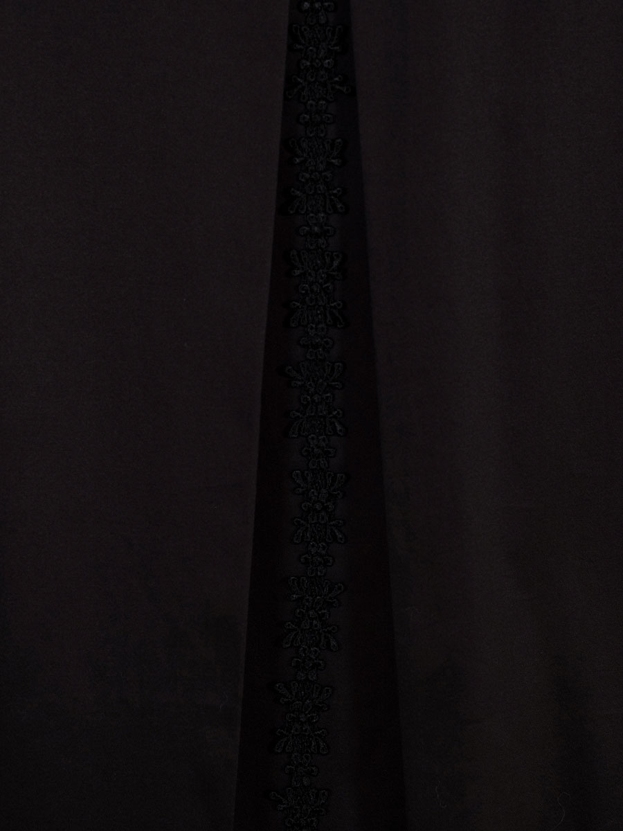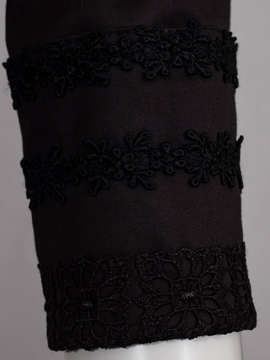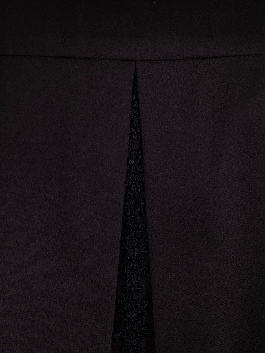 Elegante, schwarze Damenbluse mit langen Armen der Firma Wenger. Durch den Stretchanteil lässt sich die Bluse sehr angenehm tragen. Auf den breiten Manschetten an den Armabschlüssen sind schwarze Spitzenborten aufgenäht. Der Kragen ist ebenfalls auf der Vorderseite der Bluse mit Spitze verziert. Auch von hinten fällt die Bluse ins Auge. Entlang der Mitte verläuft eine Rückenfalte mit innenliegender Spitzenborte.