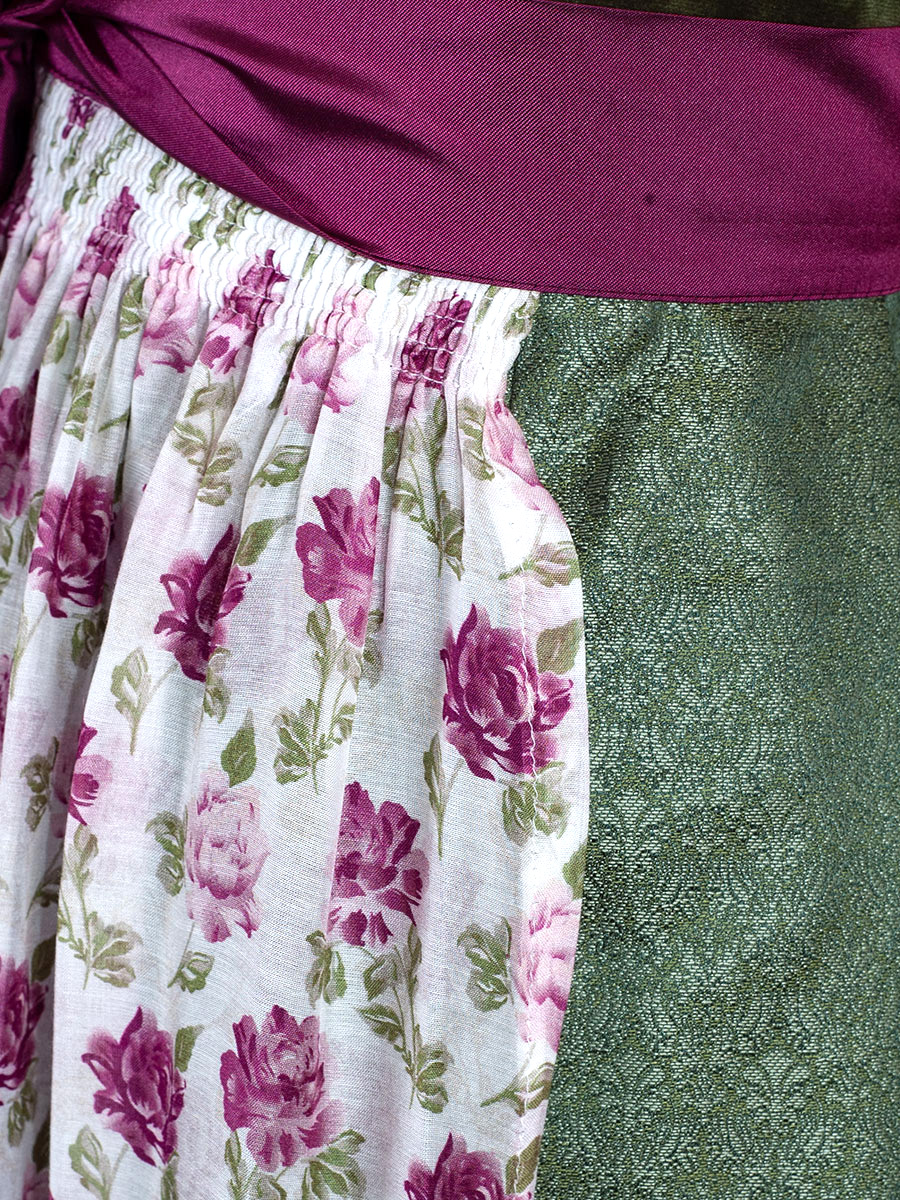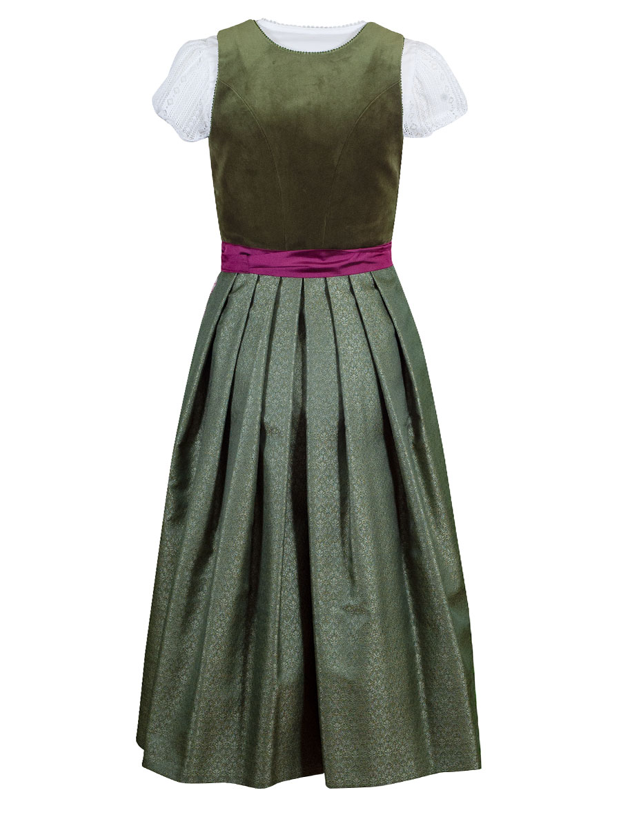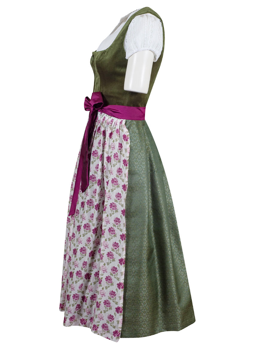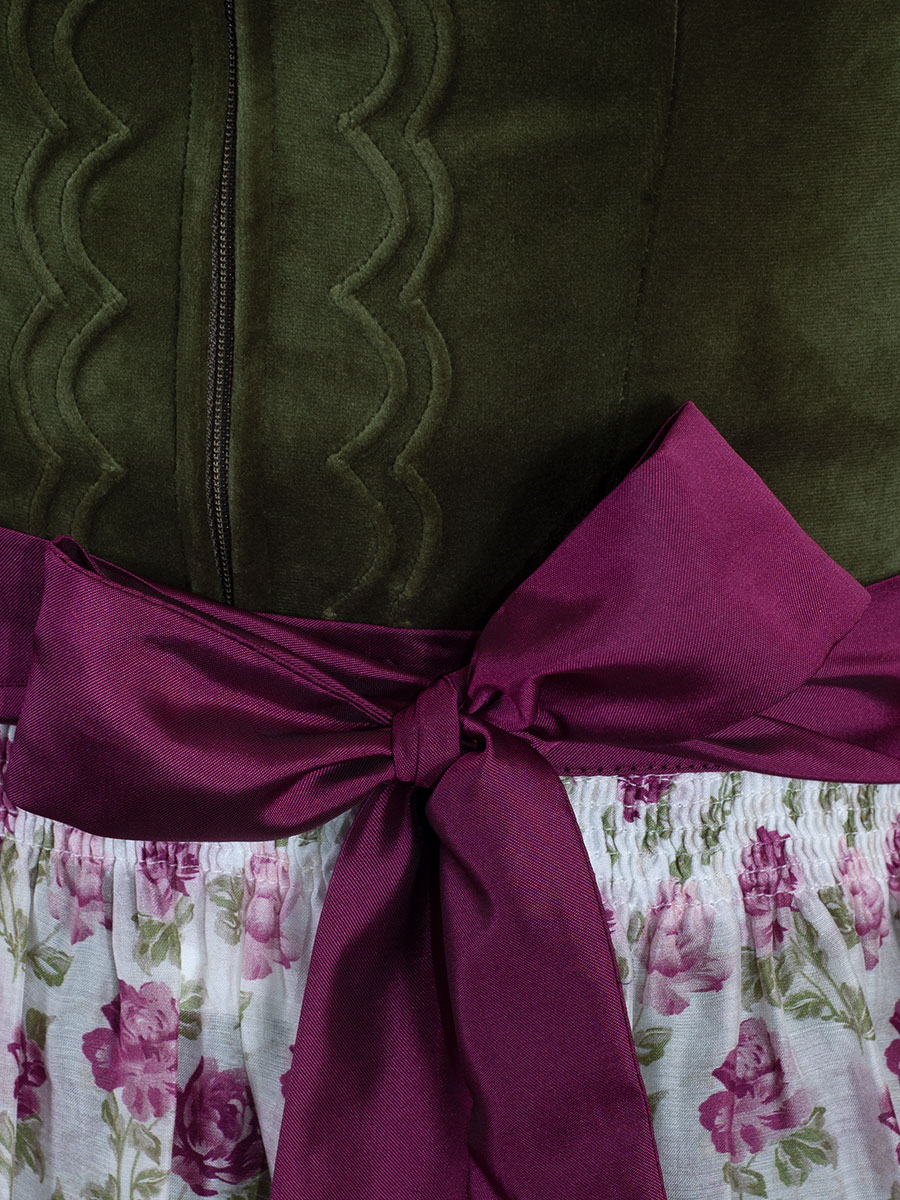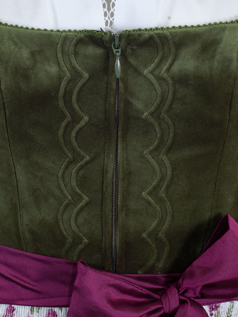 Wunderschönes Dirndl der Firma Wenger mit einem olivgrünen Oberteil in Samtoptik. Entlang des Reißverschlusses verlaufen geschwungene Paspolnähte. Der Rock des Dirndl ist festlich glänzend und in sich gemustert gewebt. Eine luftig leichte weißgrundige Schürze mit pinken und rosa Rosen bedruckt. Das pinkfarbene Satin-Schürzenband gibt einen wunderschönen Kontrast.