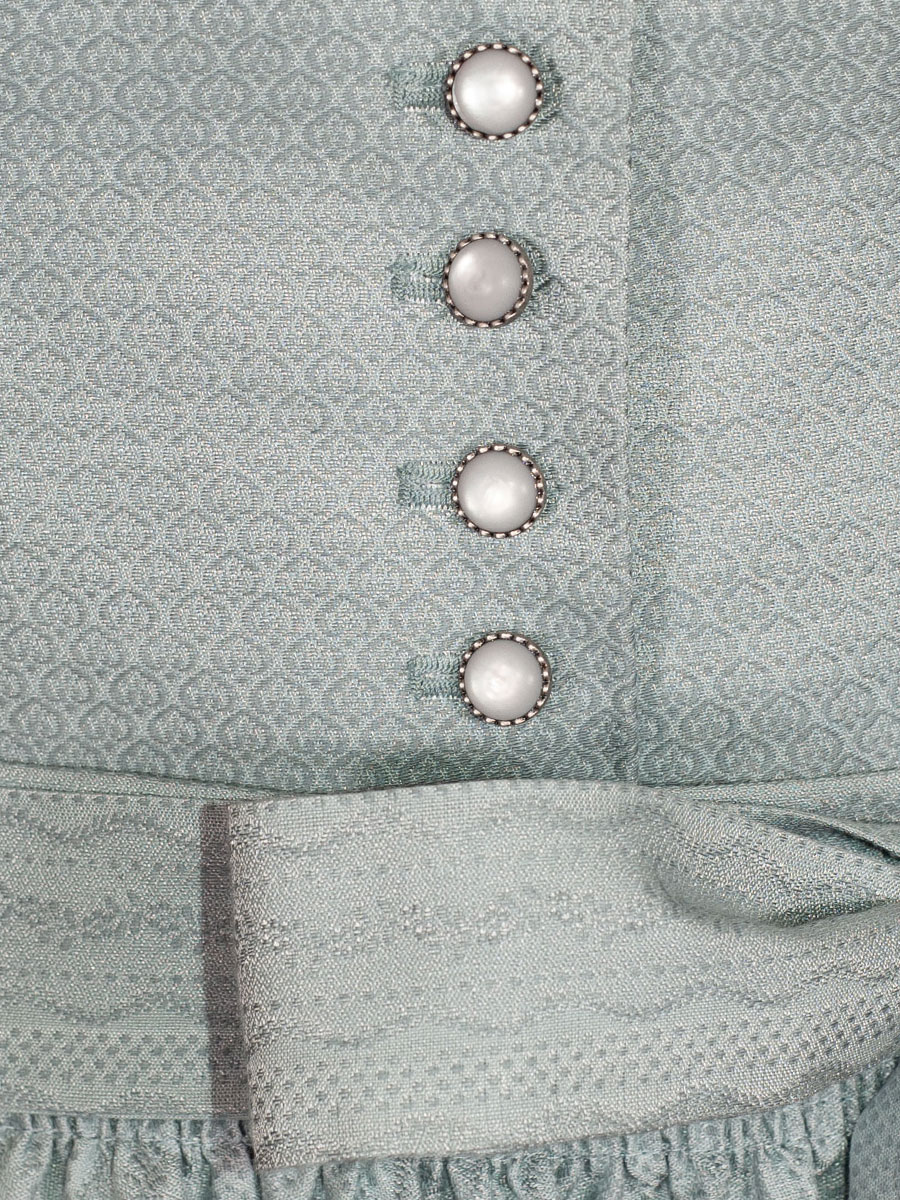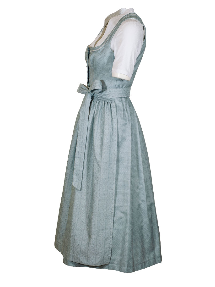 Festliches Dirndl der Traditionsfirma Wenger aus Österreich. Hellblau und salbei - zwei Farbtöne, die besonders im Frühjahr und Sommer angesagt sind. Der doppelt-abwechselnde Bisenstepp und die Borte zusammen mit der tonigen Schürze lassen das Dirndl Charlotte strahlen. Helle Farben in allen Facetten, wie hier das Dirndl Zara in einem pastelligem Mintgrün, passen perfekt für eine Trachtentraumhochzeit, wenn man nicht unbedingt in Weiß heiraten will. Der Stoff des gesamten Dirndls ist in sich elegant gemustert gewebt. Das Oberteil wird mit farblich passenden Knöpfen geschlossen und ist am Ausschnitt mit einem feinen Paspol verziert.