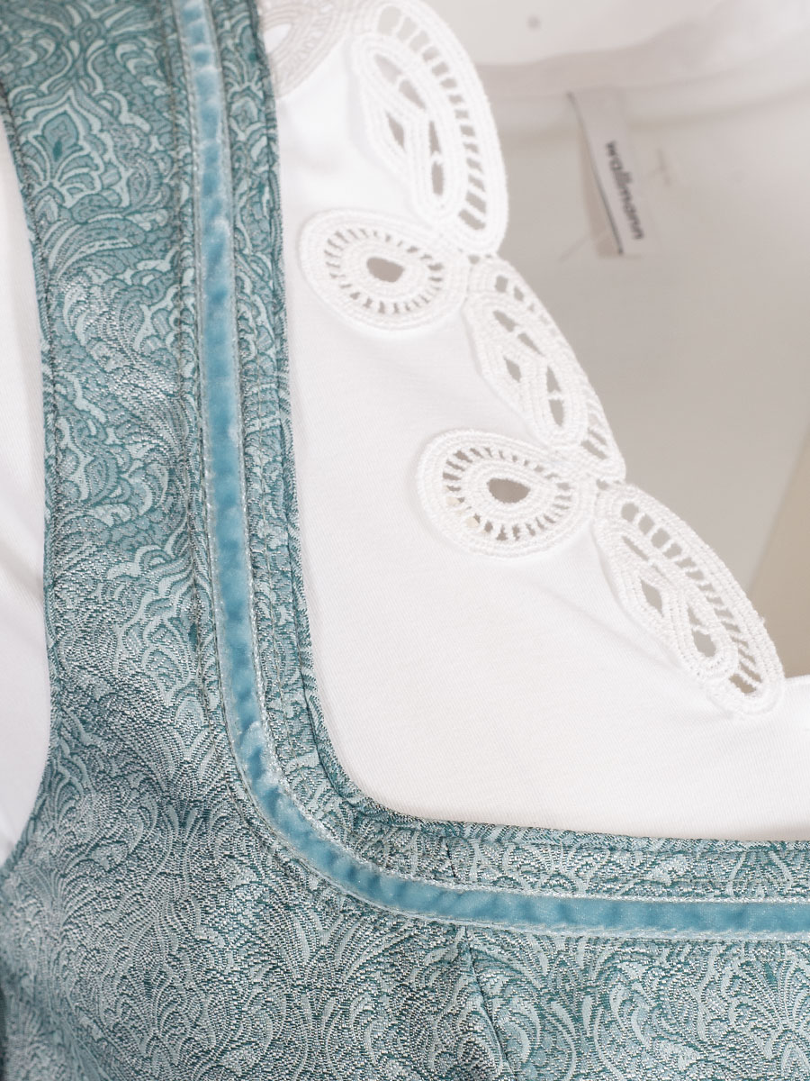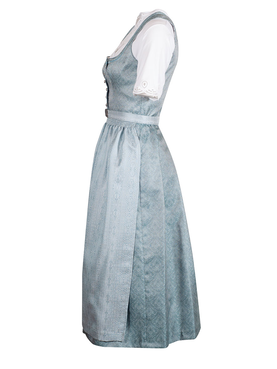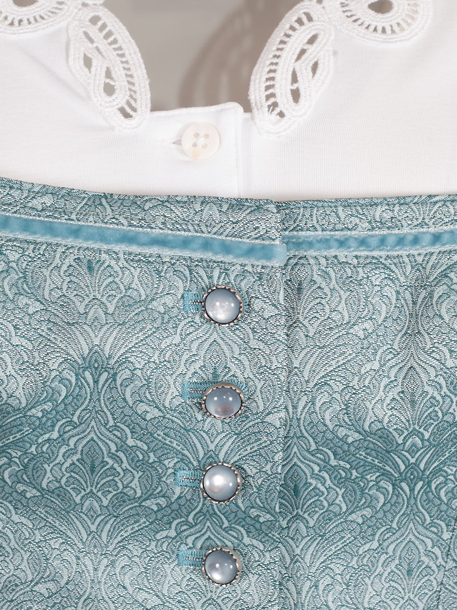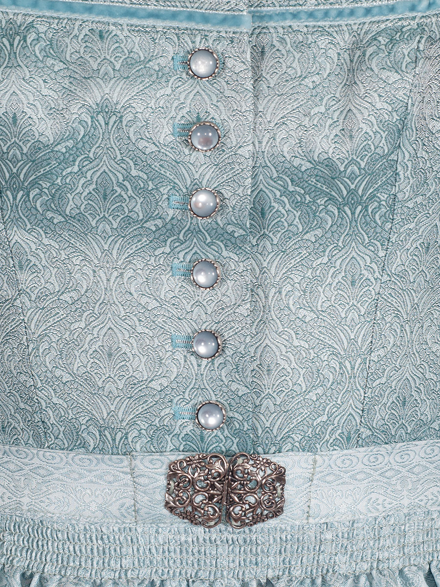 Festliches Dirndl der Firma Wenger in einem türkisfarbene, glänzenden Stoff mit Allover-Muster. Das Muster ist dezent in den Stoff gewebt. Der Ausschnitt ist mit einer farblich passenden Samtborte verziert und wird mit wunderschönen Knöpfen geschlossen. Die Schürze, ebenfalls türkisfarben, wird mit einer Schließe geschlossen.