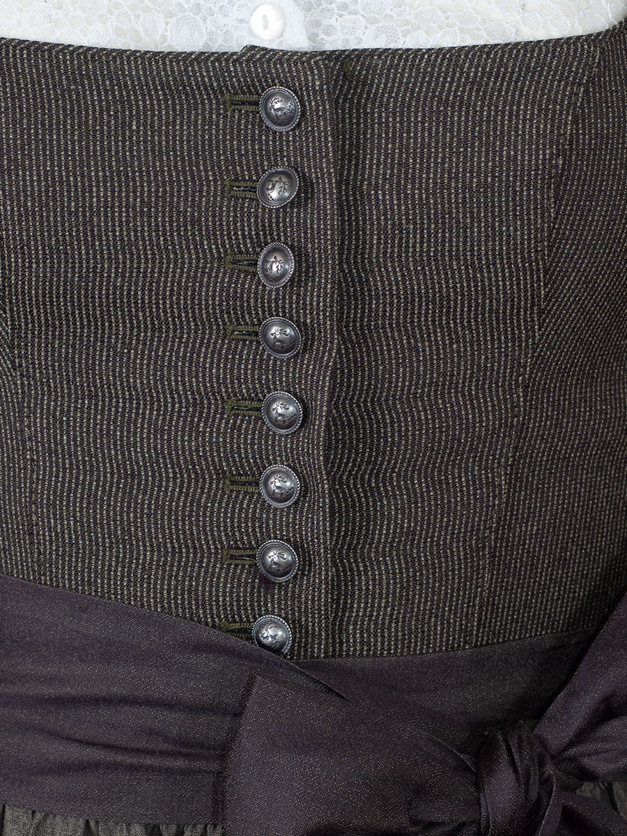 Elegantes Dirndlkleid in Olivgrün gewebt der Kollektion "Die Jägerin" der Firma Wenger. Der eckige Ausschnitt ist ohne Verzierung, Geschlossen wird das olivgrün gemusterte Oberteil mit Metallknöpfen im Jäbgerstil. Der Rock ist in Falten gelegt zeigt eine vollflächiges Blättermotiv, farblich passend zum Oberteil. Eine schlichte einfarbige Schürze rundet das Bild ab. Das dunklere Schürzenband hat an den Enden Quasten aus Gamshaaren. Ein Dirndl für alle festlichen Anlässe.