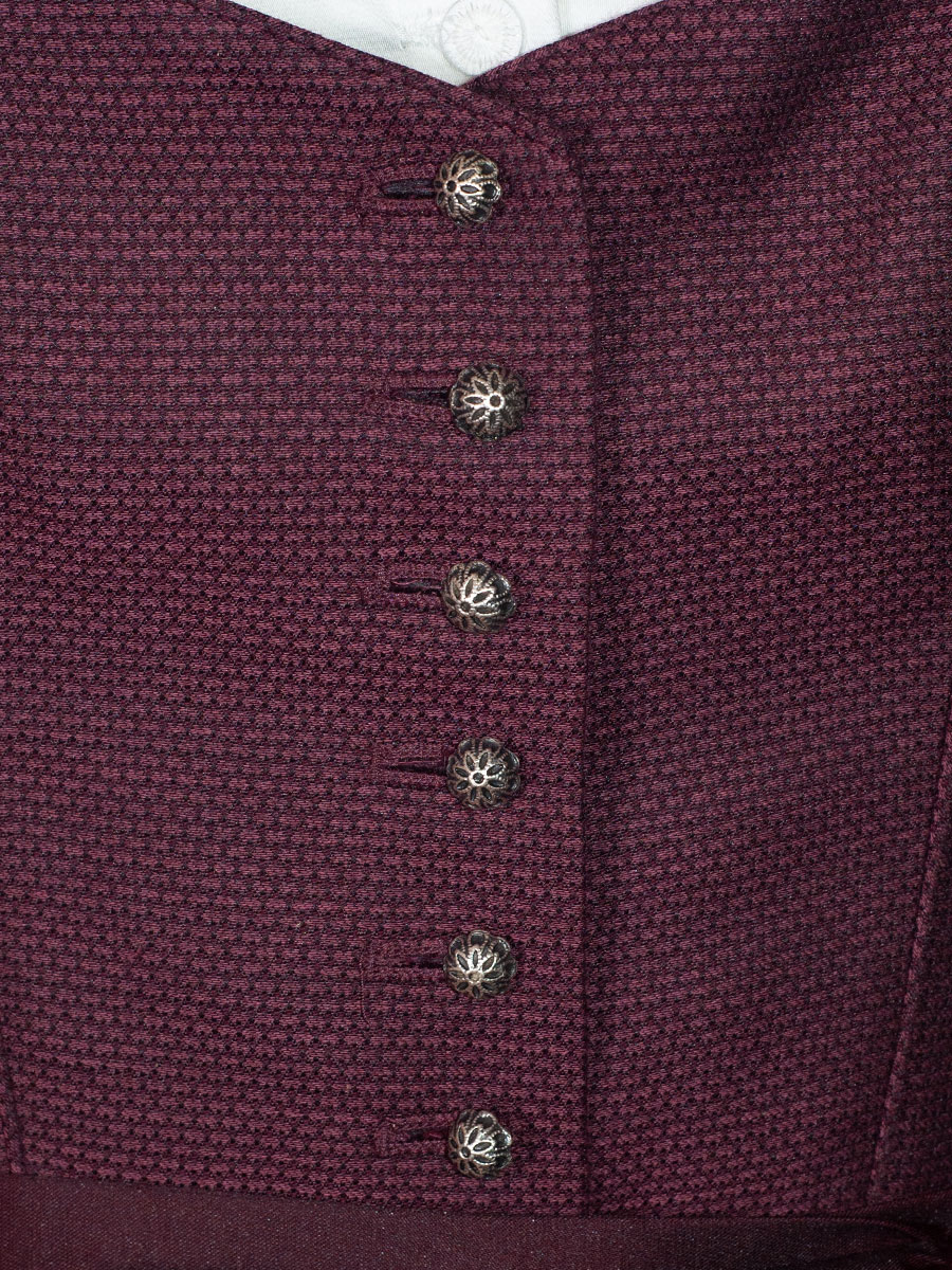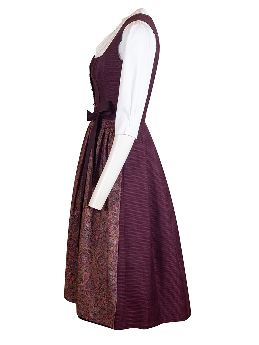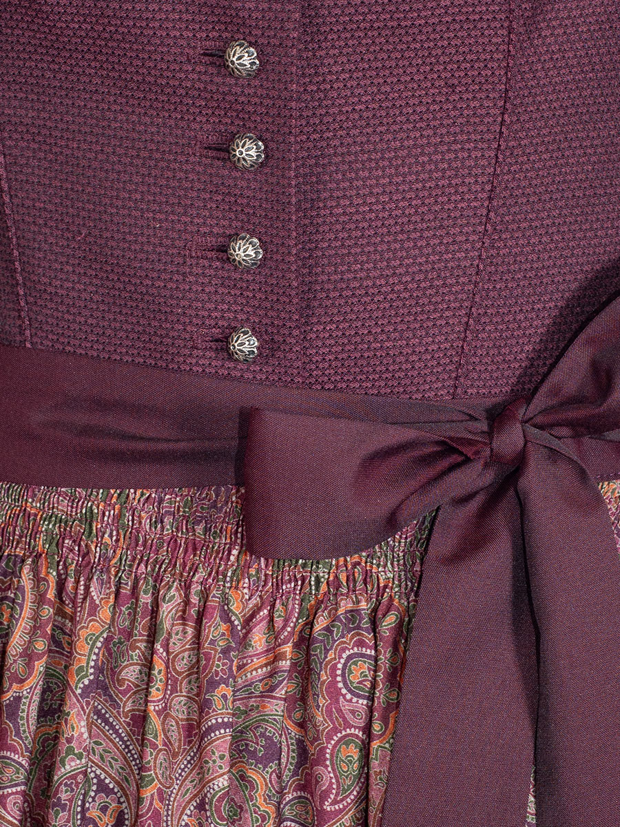 Festliches Dirndl der Firma Wenger in Weinrot. Oberteil und Rock sind aus demselben elegant gewebten Stoff in weinrot gefertigt. Der Ausschnitt ist herzförmig und mit abgesteppten Nähten verziert. Geschlossen wird das Oberteil mit gemusterten Metallknöpfen. Perfekt farblich abgestimmt wurde für die Schürze ein Paisley Alloverprint gewählt. Das Schürzenband hebt sich einfarbig Weinrot ab.