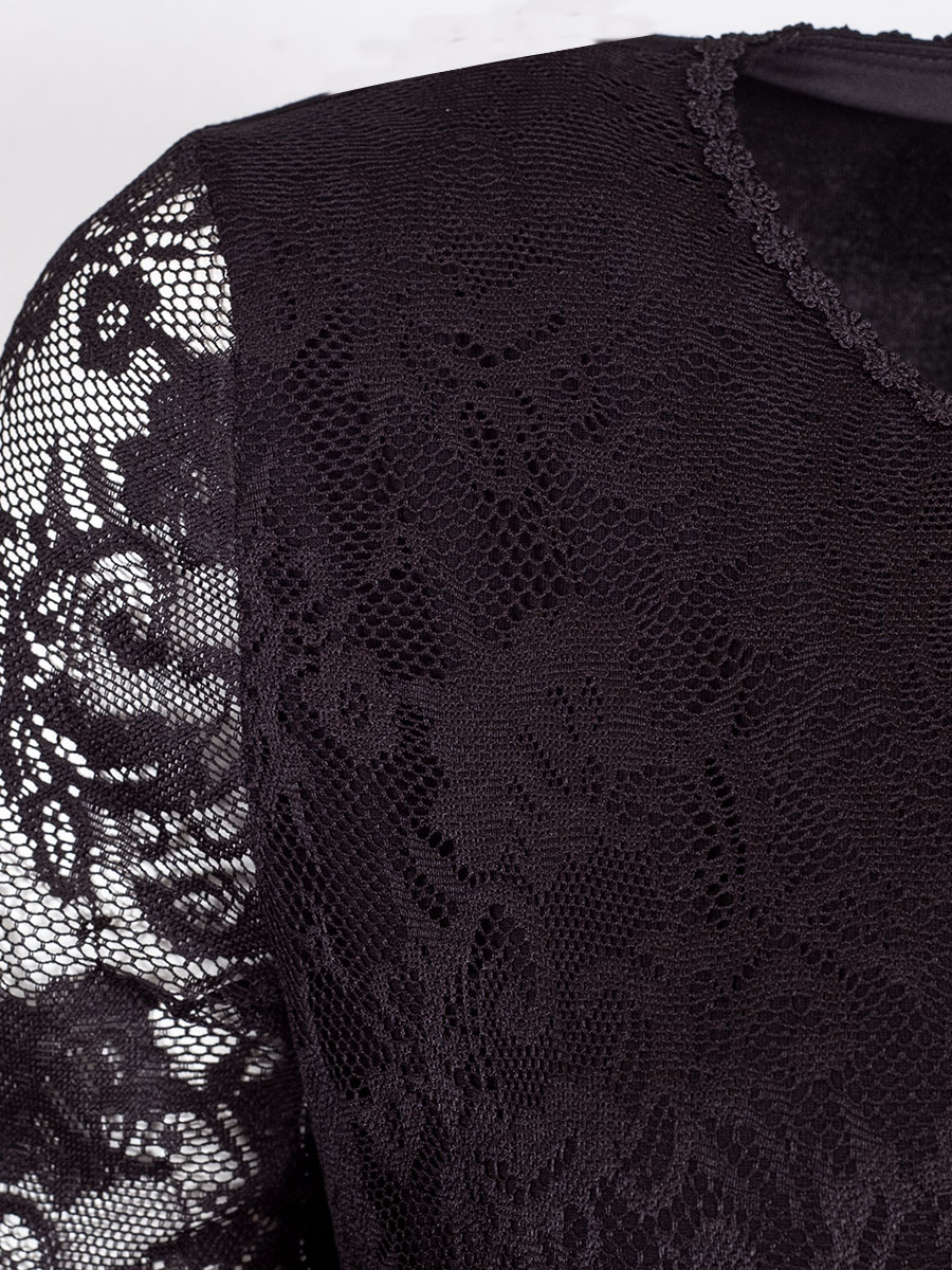 Eleganter Spitzenbody in schwarz der Firma Wenger. Der Body hat kurze Arme und einen Rundhalsausschnitt der mit einem schwarzen Wäscheknopf geschlossen wird. Etwas weitere unten beginnt eine Knopfleiste bis zum Höschen. Dieses und der Rücken sind aus Shirtstoff und dadurch sehr angenehm zu tragen. Der Rest des Bodys ist aus Spitze genäht. Das Höschen wird mit drei Druckknöpfen geschlossen.
