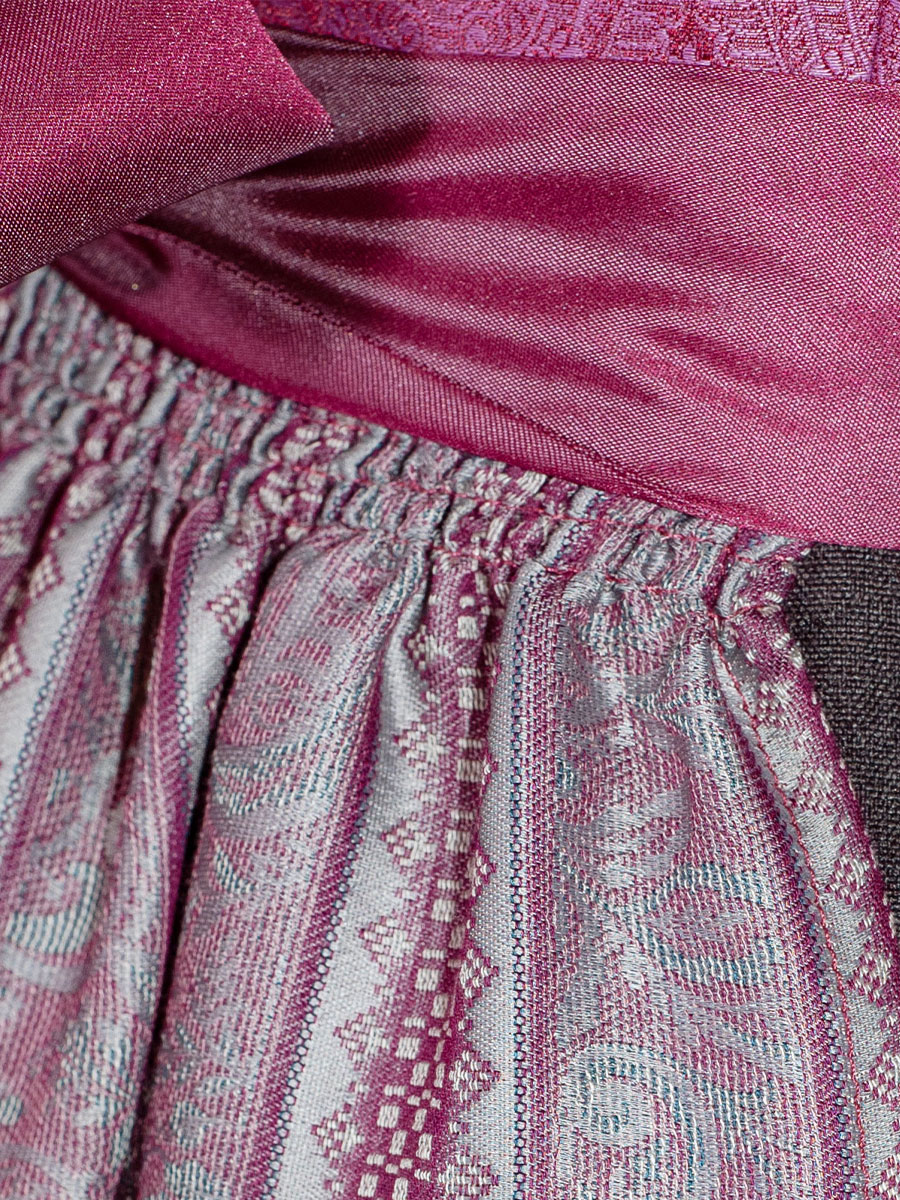 Festliches Dirndl der Traditionsfirma Wenger aus Österreich. Das Oberteil ist elegant in bordeaux mit Muster gewebt und ist u m den Ausschnitt mit einer Zackenborte verziert. Geschlossen wird das Drindl mit gemusterten Metallknöpfen. Der dunkelgraue Rock fällt weich nach unten und hat eine Rocktasche. Die ebenfalls schimmernde Schürze rundet das Kleid ab. Sie ist längsgestreift gewebt, passt farblich zum Oberteil und hat ein einfarbiges, bordeauxfarbenes Schürzenband. Ein rundum elegantes Dirndl für die Festl.