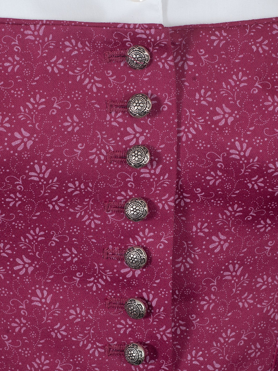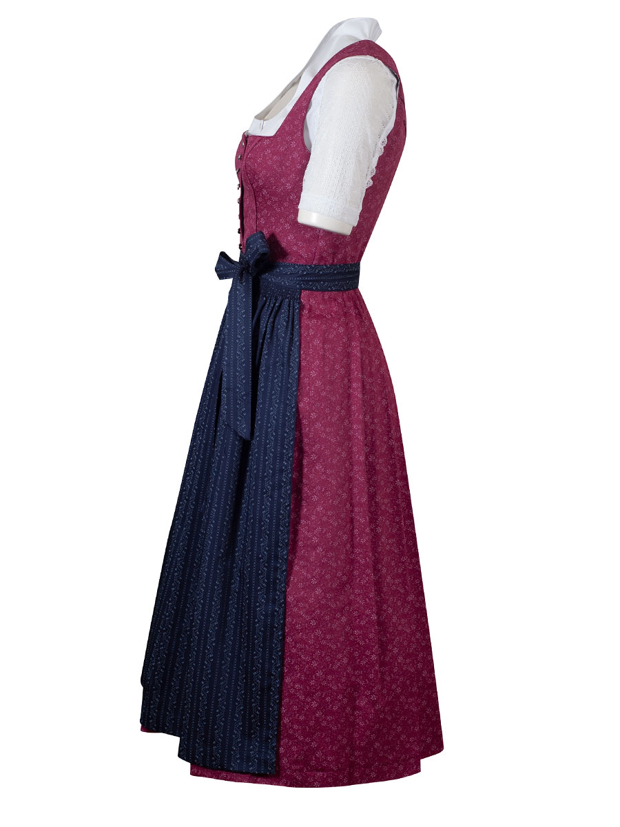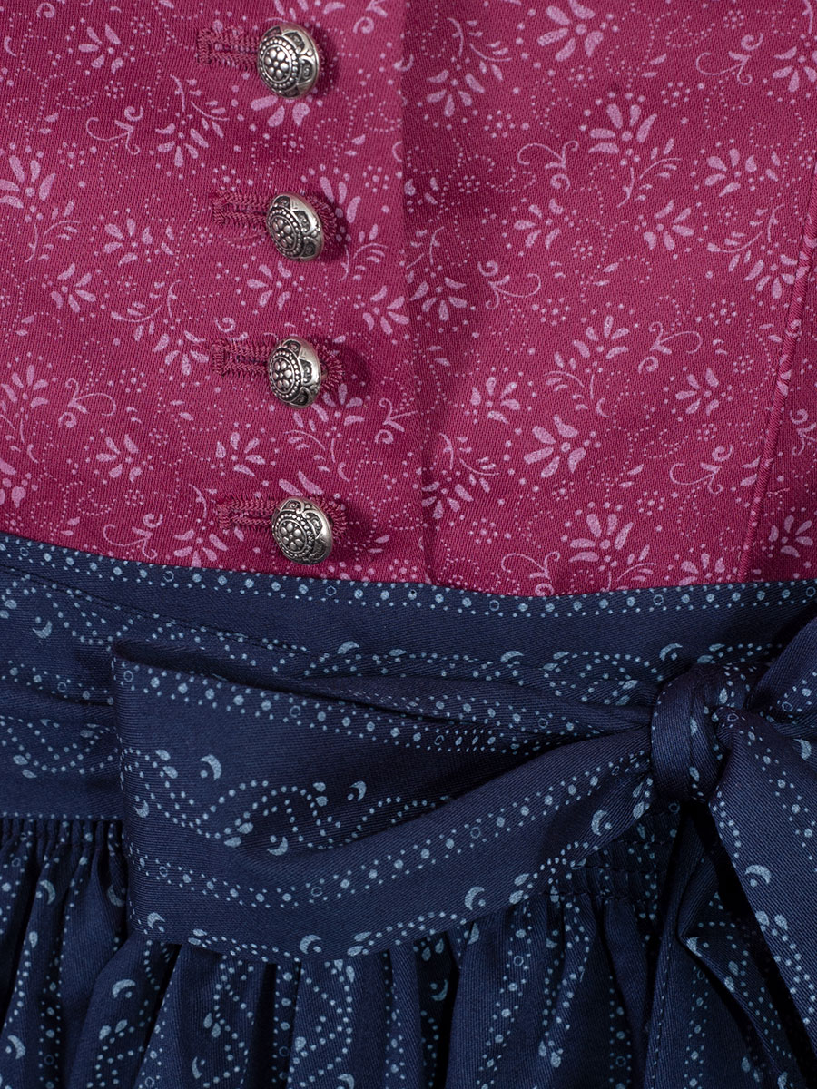 Schlichtes, sommerliches Dirndlkleid aus angenehmer Baumwolle der Firma Wenger. Der beerenfarbene Stretch-Stoff von Oberteil und Rock ist mit weißen Blümchen im Halbdruck bedruckt. Der eckige Ausschnitt ist schlicht gehalten. Die dunkelblaue Schürze ist mit Blumenornamenten und Ranken in weiß längsgestreift. Geschlossen wird das Baumwolldirndl mit silberfarbenen, gemusterten Knöpfen in Blümchenform.