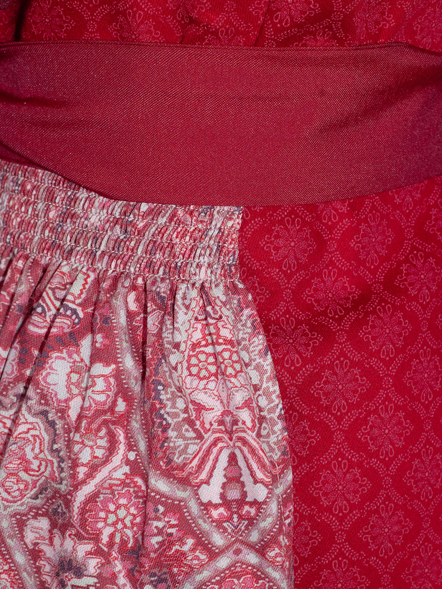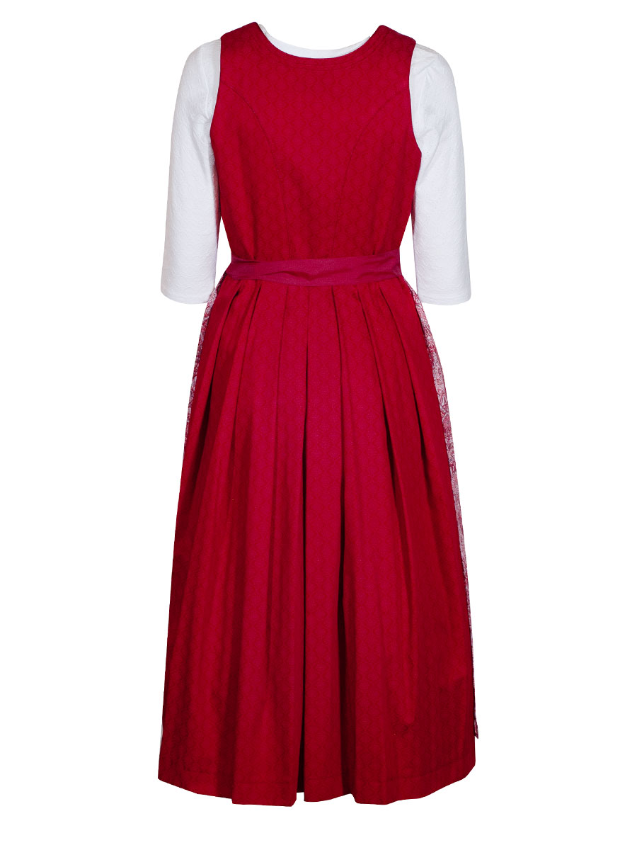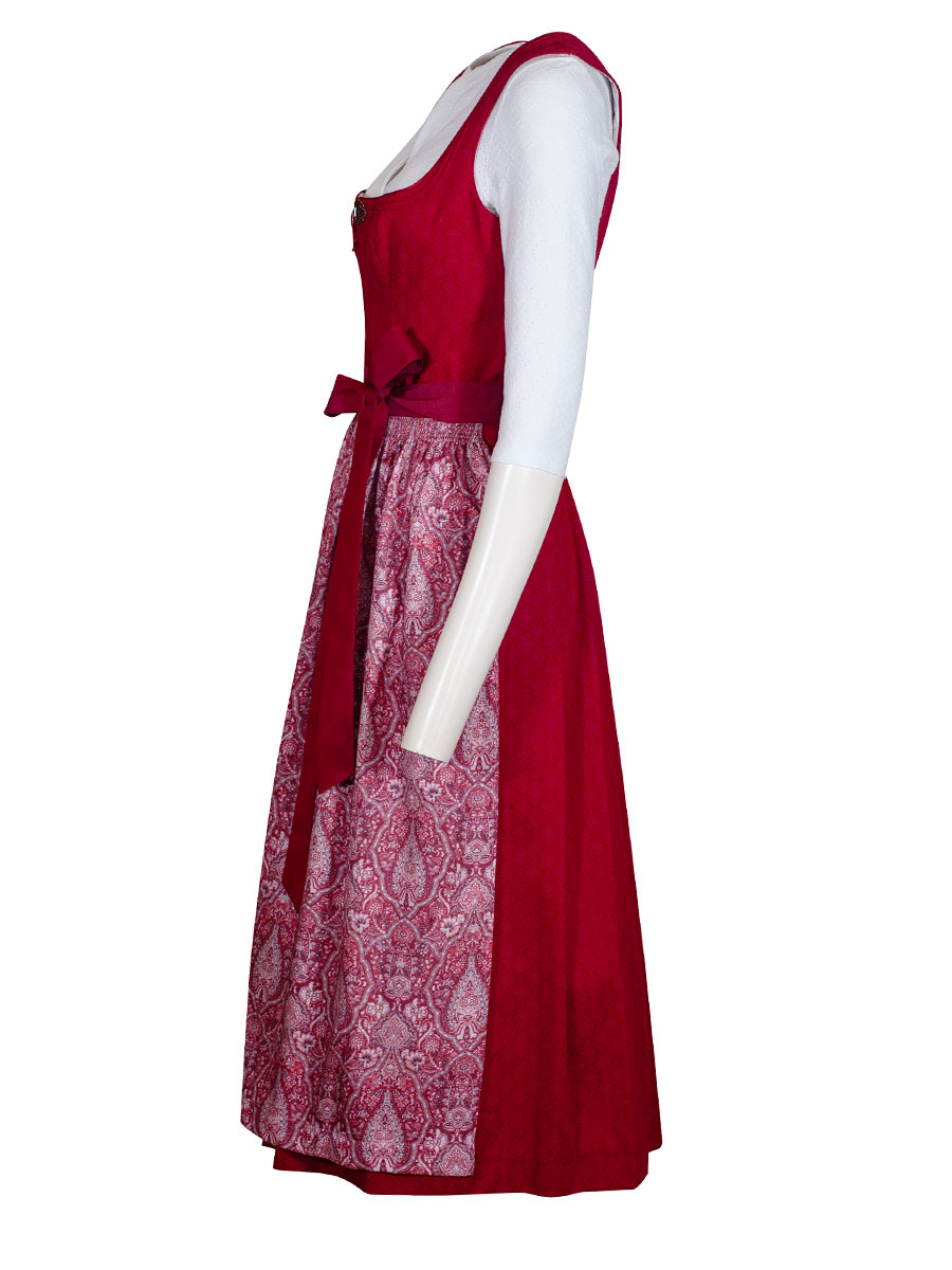 Elegantes Dirndl aus Baumwolle der Traditionsfirma Wenger aus Österreich. Für Oberteil und der Rock wurde ein roter Stoff gewähöt, welcher mit rautenförmigem Muster bedruckt ist. Das Oberteil wird mit Reißverschluss geschlossen, an dessen Ende eine Metallschließe sitzt. Eine weißgrundige Schürze mit Allover-Print rundet das Bild ab. Auch hierfür wurden rote Farbtöne verwendet. Das Schürzenband ist einfarbig Rot.